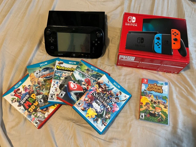 Switch is used but still in good condition, joycons don’t drift. Wii U is old but still works great, although no wiimotes or sensor bar unfortunately :( Cables included: -1 switch power cable -1 HDMI cable -1 Wii U power cable -1 Wii U Gamepad charging cable PRICE IS NON-NEGOTIABLE