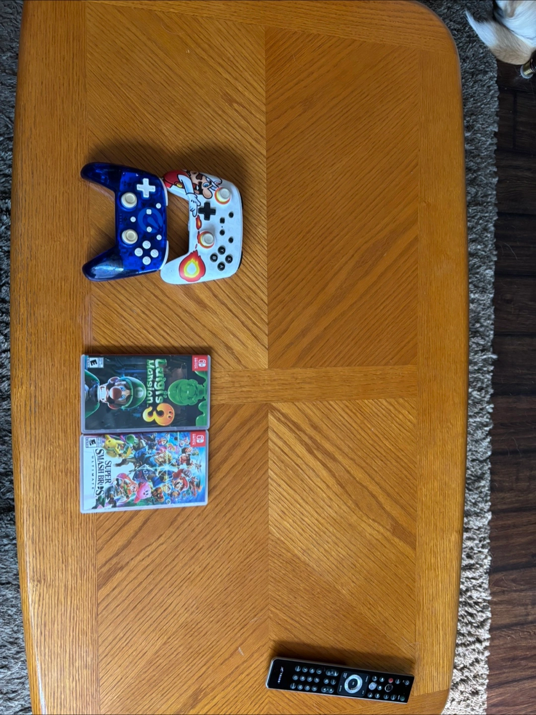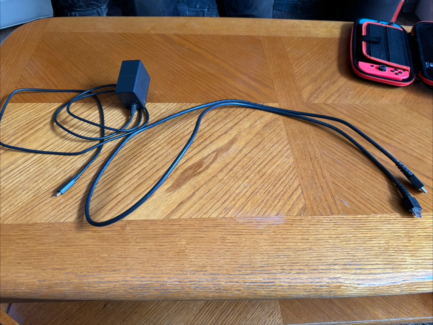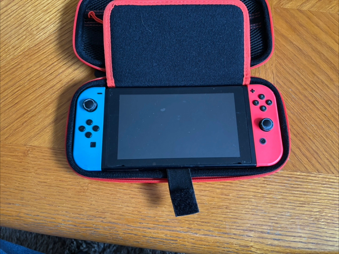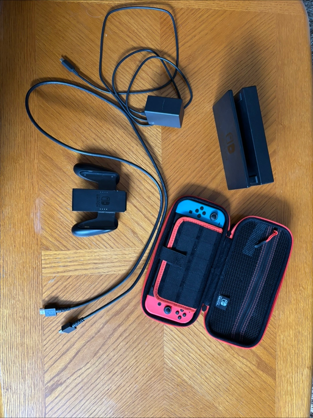 20Nintendo Switch console, carrying case, Joy-Con controllers, charging cable, dock, power adapter, and two games: Super Smash Bros. Ultimate and Luigi's Mansion 3. Includes a 128GB SanDisk microSD card. Great condition.