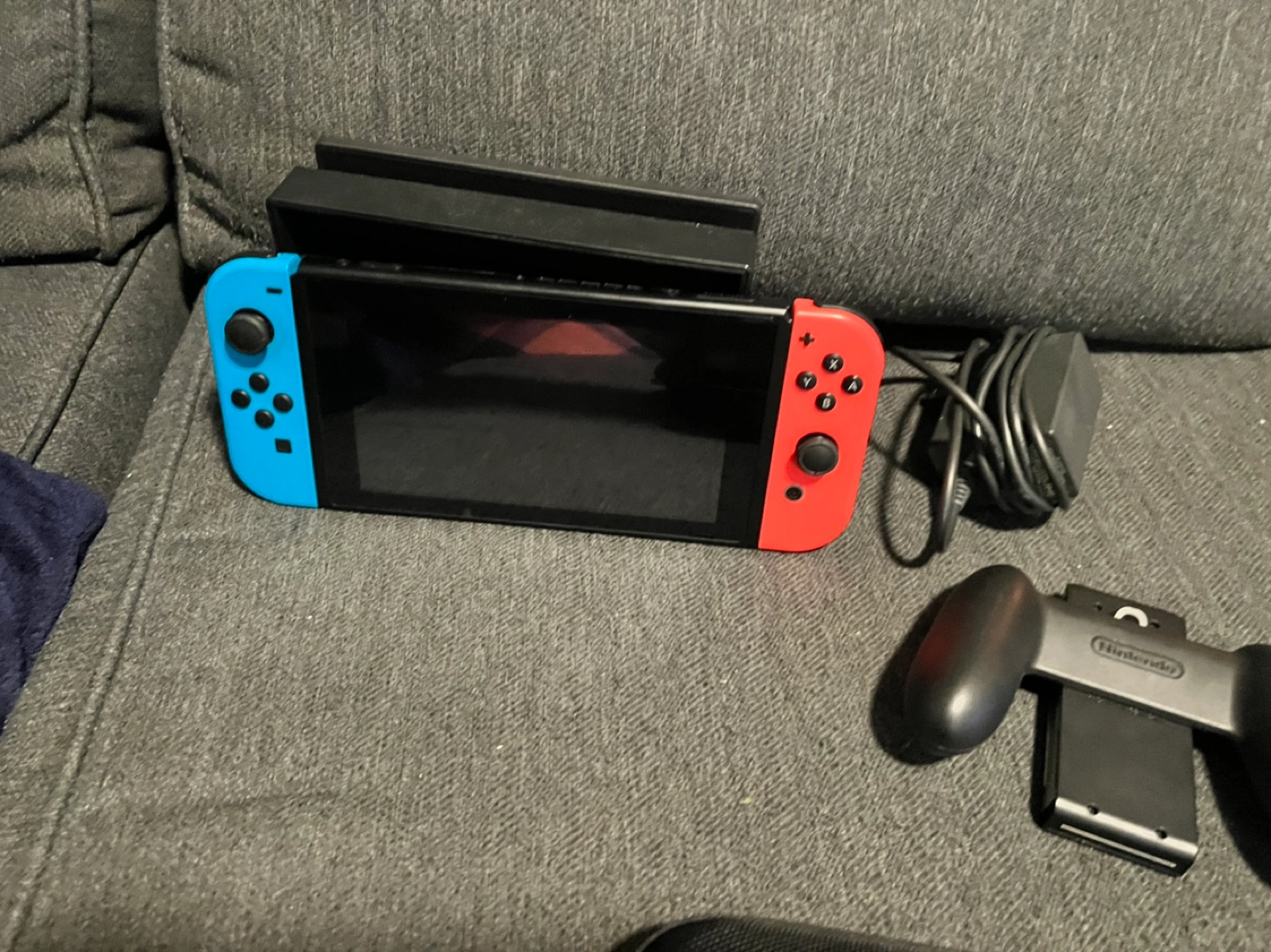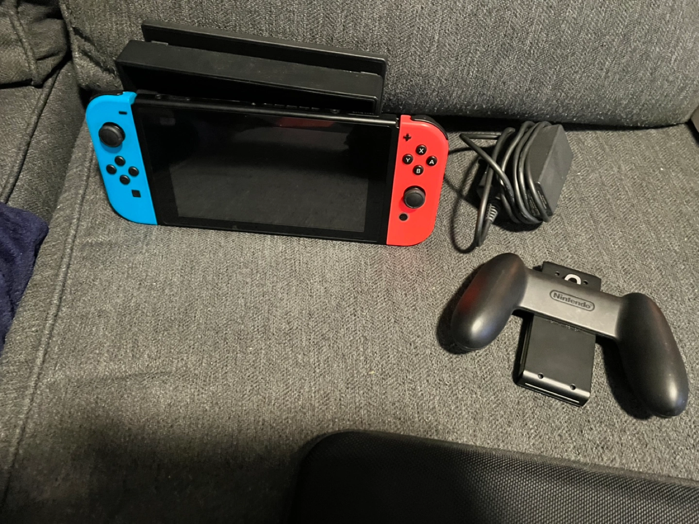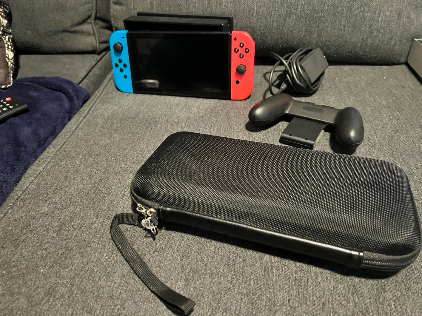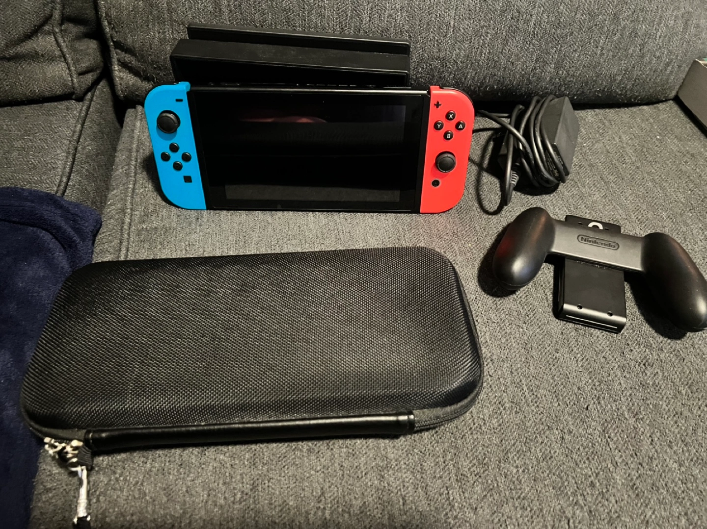 Nintendo Switch console, blue and red joy-cons. Includes dock, charger, and carrying case. Also comes with a Nintendo-branded grip.