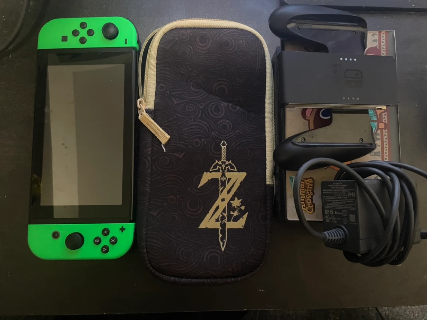 Selling a Nintendo Switch console with green joy-cons. Also includes a Zelda-themed carrying case, the dock, and power adapter.