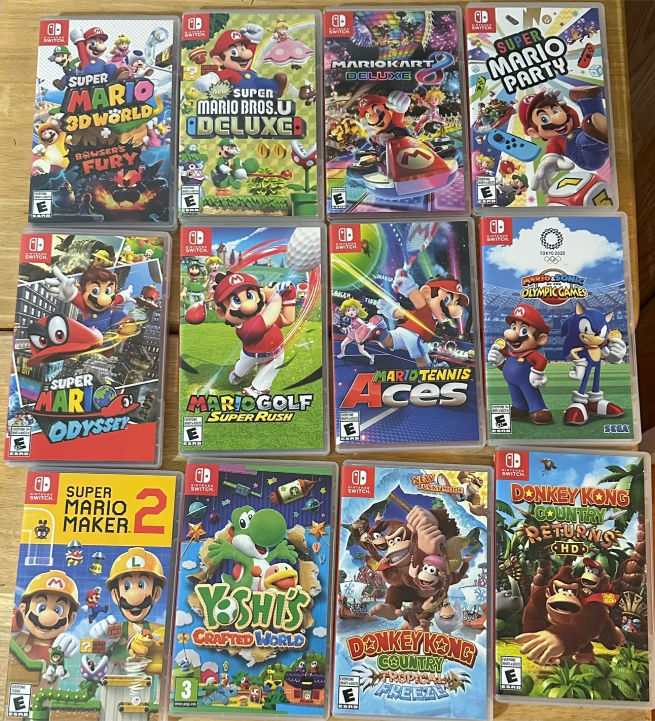 551Selling a collection of Nintendo Switch games! Titles include: - Super Mario 3D World + Bowser's Fury $60 - New Super Mario Bros U Deluxe $55 - Mario Kart Deluxe $60 - Super Mario Party $50 - Super Mario Odyssey $50 - Mario Golf Super Rush $55 - Mario Tennis Aces $45 - Mario & Sonic Olympic Games Tokyo 2020 $40 - Super Mario Maker 2 $50 - Yoshi's Crafted World $50 - Donkey Kong Country Tropical Freeze $50 - Donkey Kong Country Returns HD $60 If your purchase more than 3 games I can deliver within Vancouver
