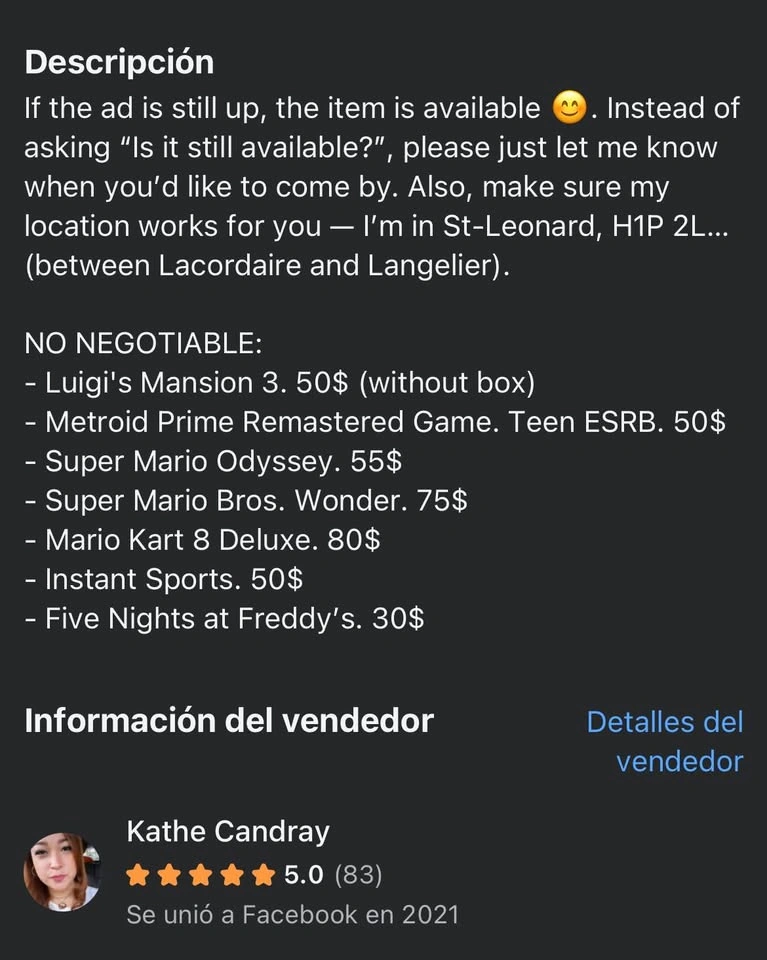 38If the ad is still up, the item is available đ. Instead of asking âIs it still available?â, please just let me know when youâd like to come by. Also, make sure my location works for you â Iâm in StâLeonard, H1P 2L⊠(between Lacordaire and Langelier). NO NEGOTIABLE: - Luigi's Mansion 3. 50$ (without box) - Metroid Prime Remastered Game. Teen ESRB. 50$ - Super Mario Odyssey. 55$ - Super Mario Bros. Wonder. 75$ - Mario Kart 8 Deluxe. 80$ - Instant Sports. 50$ - Five Nights at Freddyâs. 30$