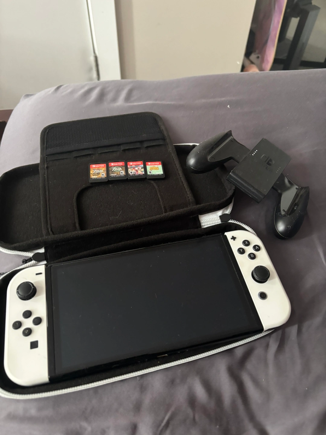 23White Nintendo Switch console. Includes carrying case, and a grip controller. Minor cosmetic wear. Pre-owned. Games are not included!!!!! and 256gb storage