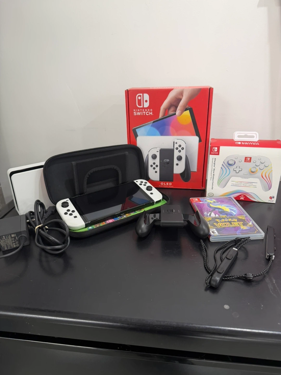 60Selling a Nintendo Switch OLED White Edition in great condition! Included: - Nintendo Switch OLED console - White Joy-Cons - Dock - Charger - Carrying case - Game: Pokemon Violet - Nintendo Switch Pro Controller