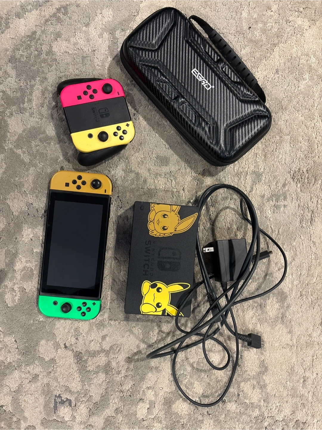 25Selling a Nintendo Switch with some fun accessories! It comes with a Pikachu and Eevee themed dock, a black carrying case, and a charger. The joy-cons are a mix of colours - pink, yellow and green! The yellow and pink Joy cons don’t work 100%, but we’re just throwing that in for free as we don’t need them anymore