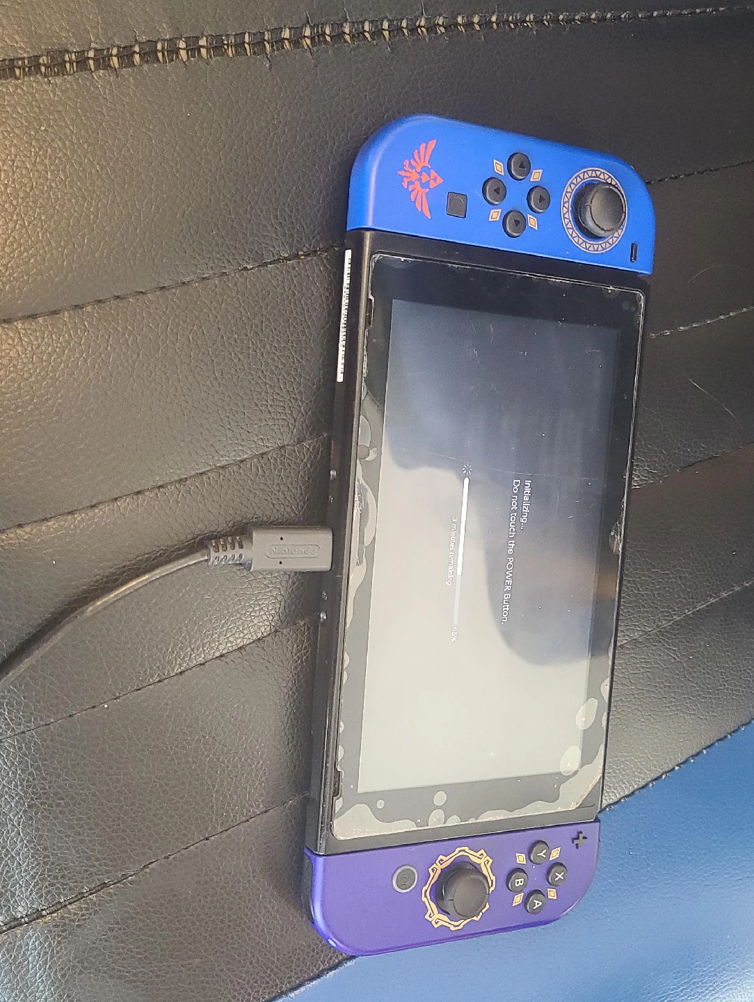 59Selling a Nintendo Switch with a Zelda-themed joycon set. It's in used condition, with some wear and tear on the screen and body as shown in the pictures. Comes with a charging cable & dock. OLDEST VERSION. no hdmi, and vent is broken on top but still works. PRICE FIRM.