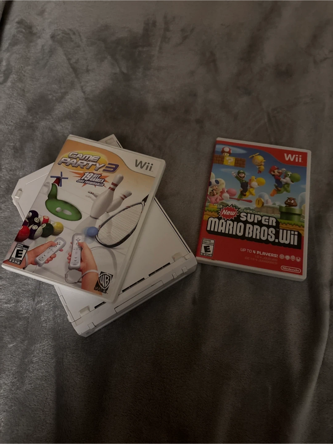 82Selling a Nintendo Wii console. It comes with two games: New Super Mario Bros Wii and Game Party 3. Great for some family fun! I lost all the controller and wires for the tv to wii