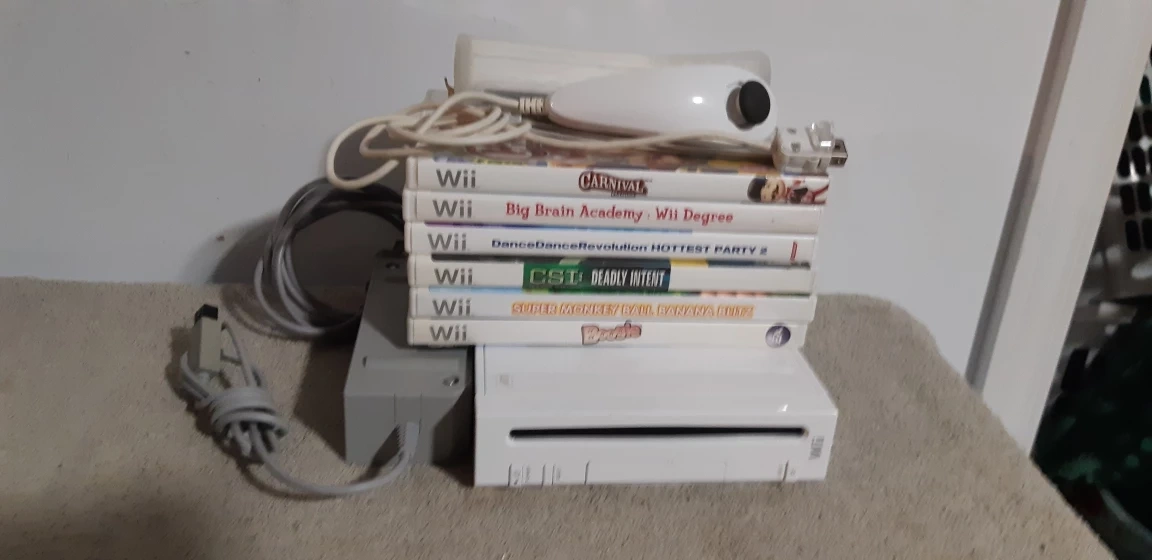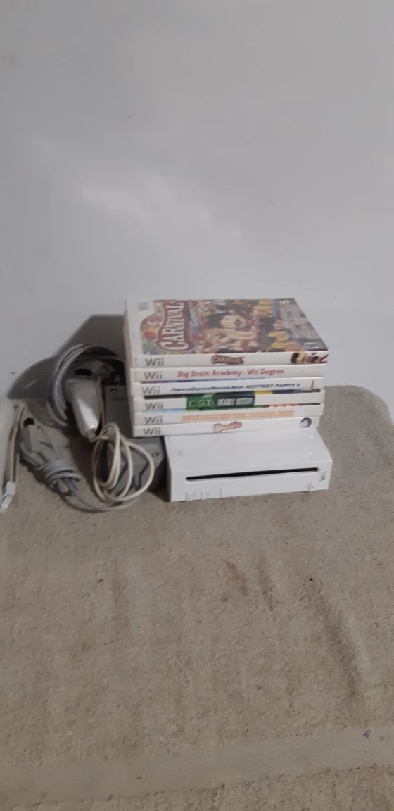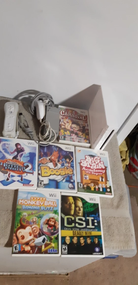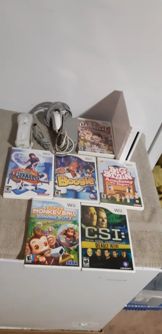 29White Wii console, 1 Wii mote and six games. Games include: Super Monkey Ball Banana Blitz, Boogie, Big Brain Academy, CSI: Deadly Intent, Dance Dance Revolution Hottest Party 2, and Carnival. Includes power cord. Please see images for more details.