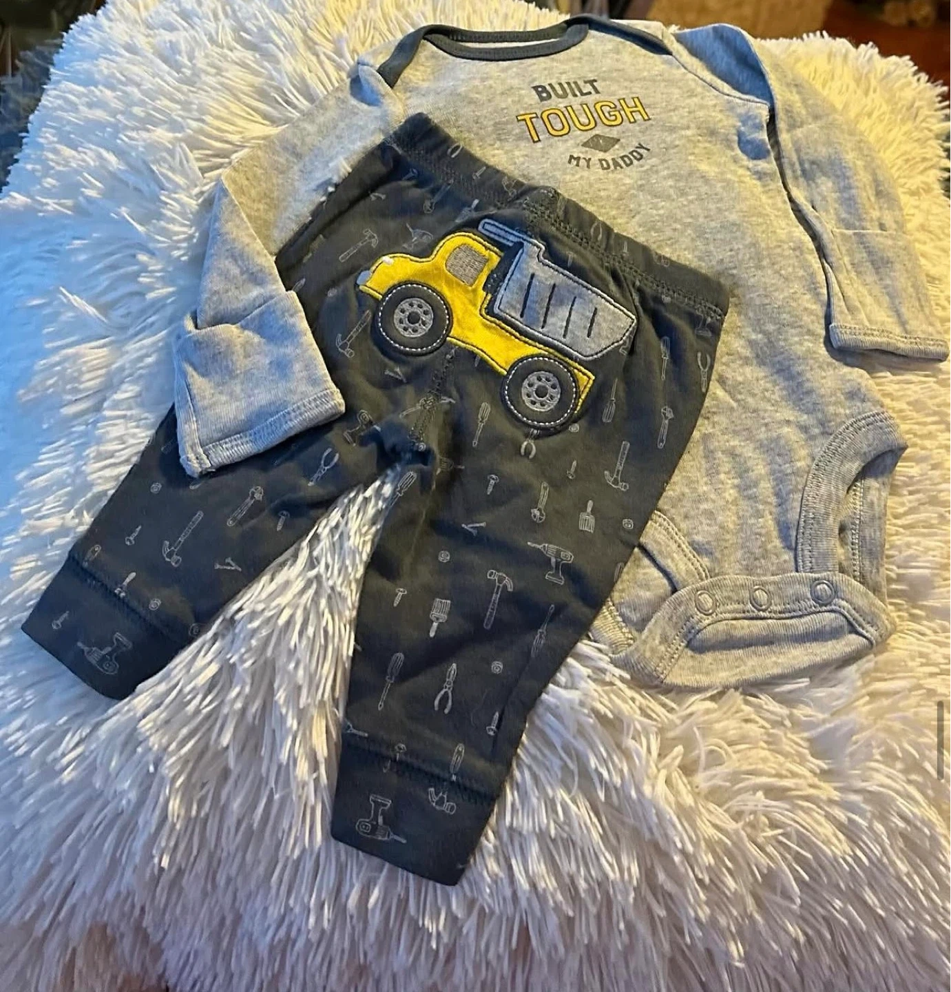 This adorable baby set includes a grey long-sleeve onesie with "Built Tough My Daddy" text and a dump truck graphic. It's paired with matching dark grey pants featuring a pattern of tools and a large yellow dump truck on the on the back, The onesie has snap closures at the crotch for easy changes.