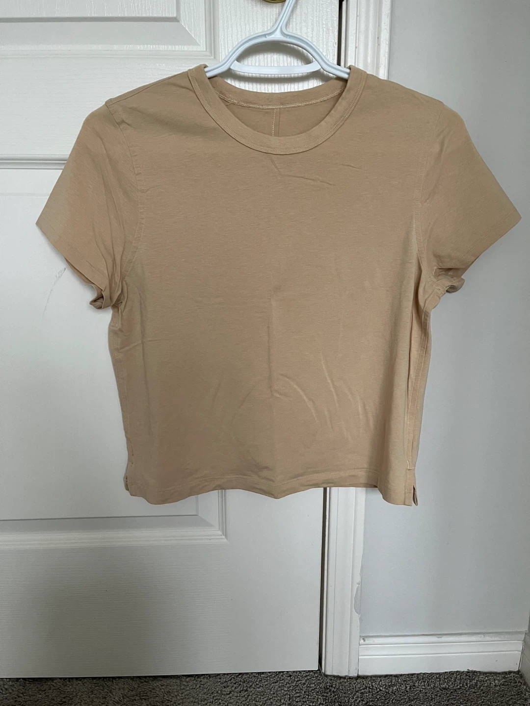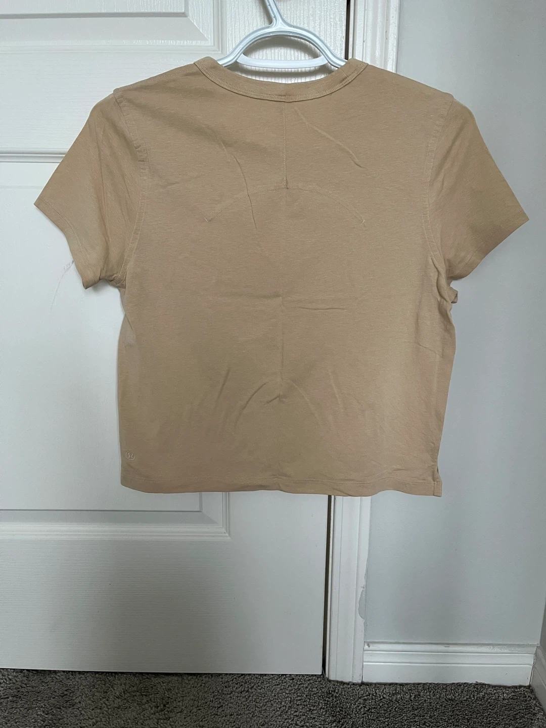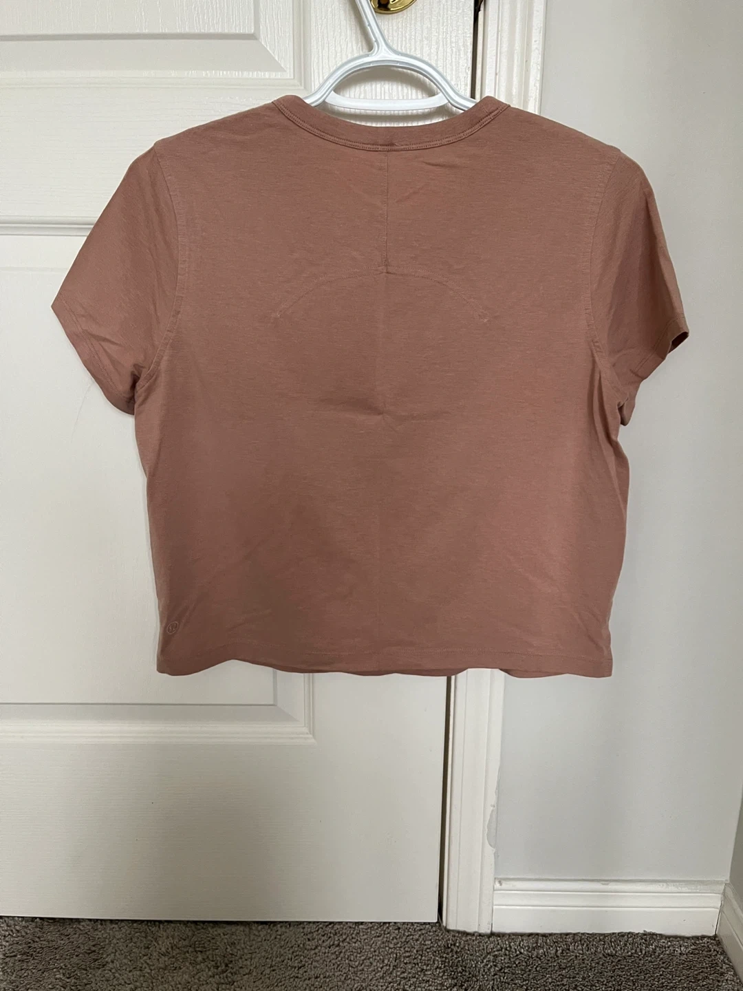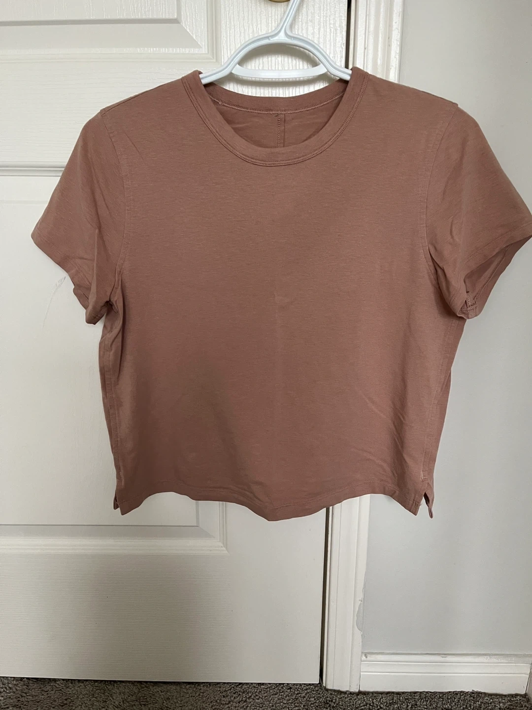 Two Lululemon Classic-Fit Cotton-Blend T-shirts, one in Pink Clay and one in Prosecco. Both are size 4. They're made of a comfortable cotton blend. These are great everyday tees!