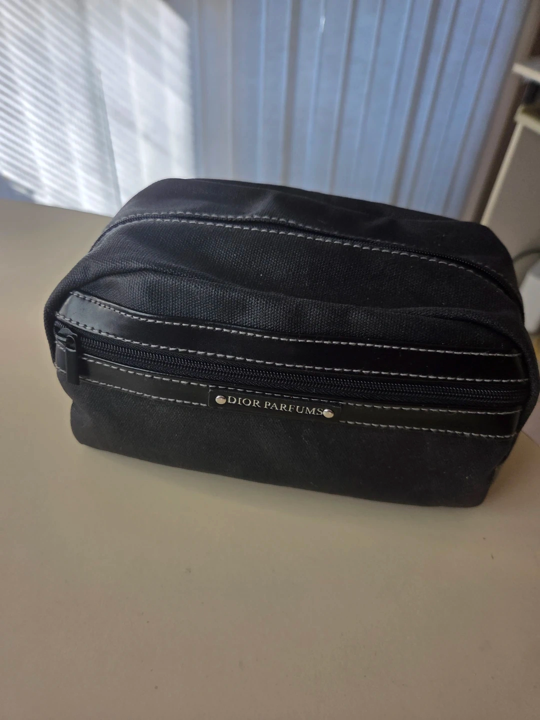 This NEW black canvas toiletry bag is from Dior Parfums. It's a handy size for travel essentials. The bag features a zippered main compartment and an additional zippered pocket on the front.