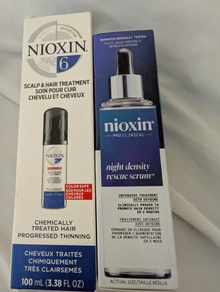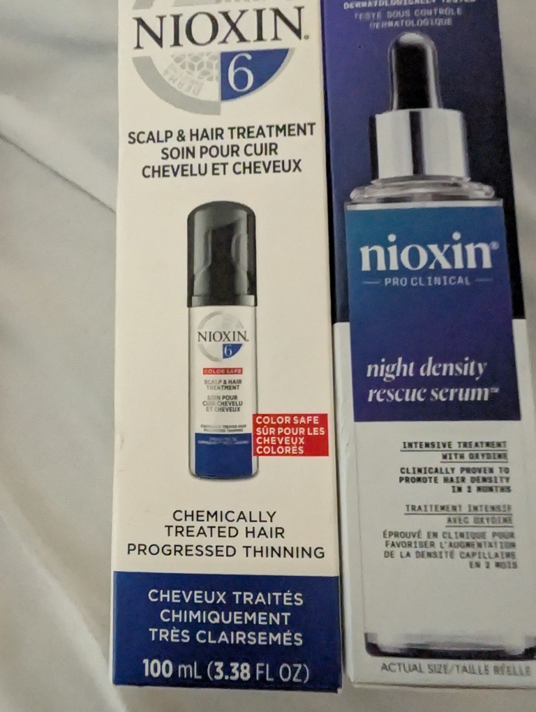 143Selling a Nioxin set for chemically treated hair and progressed thinning. This includes the Nioxin Scalp & Hair Treatment and the Nioxin Pro Clinical Night Density Rescue Serum. The scalp treatment is 100ml (3.38 FL OZ).