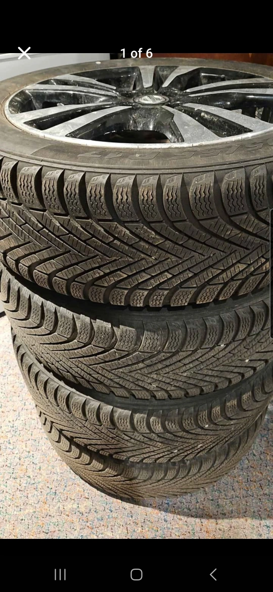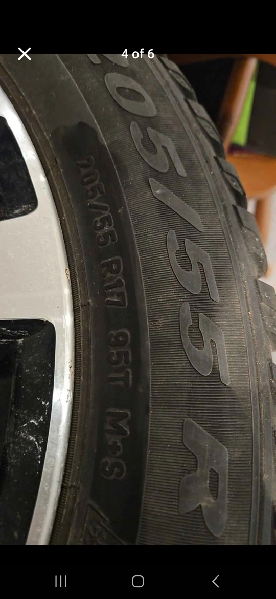 18Set of 4 Pirelli winter tires 205/55 R17 with Aluminum Nissan Rims Used with tread left on them 4 Bolt tires One tire was repaired from puncture, can confirm it holds air. Purchased for my vehicle only to realize that I needed 5 bolt instead of four. They came to me used and 1 tire was punctured. Reselling without having used them. Aluminum rims have slight scratches but are in great condition.