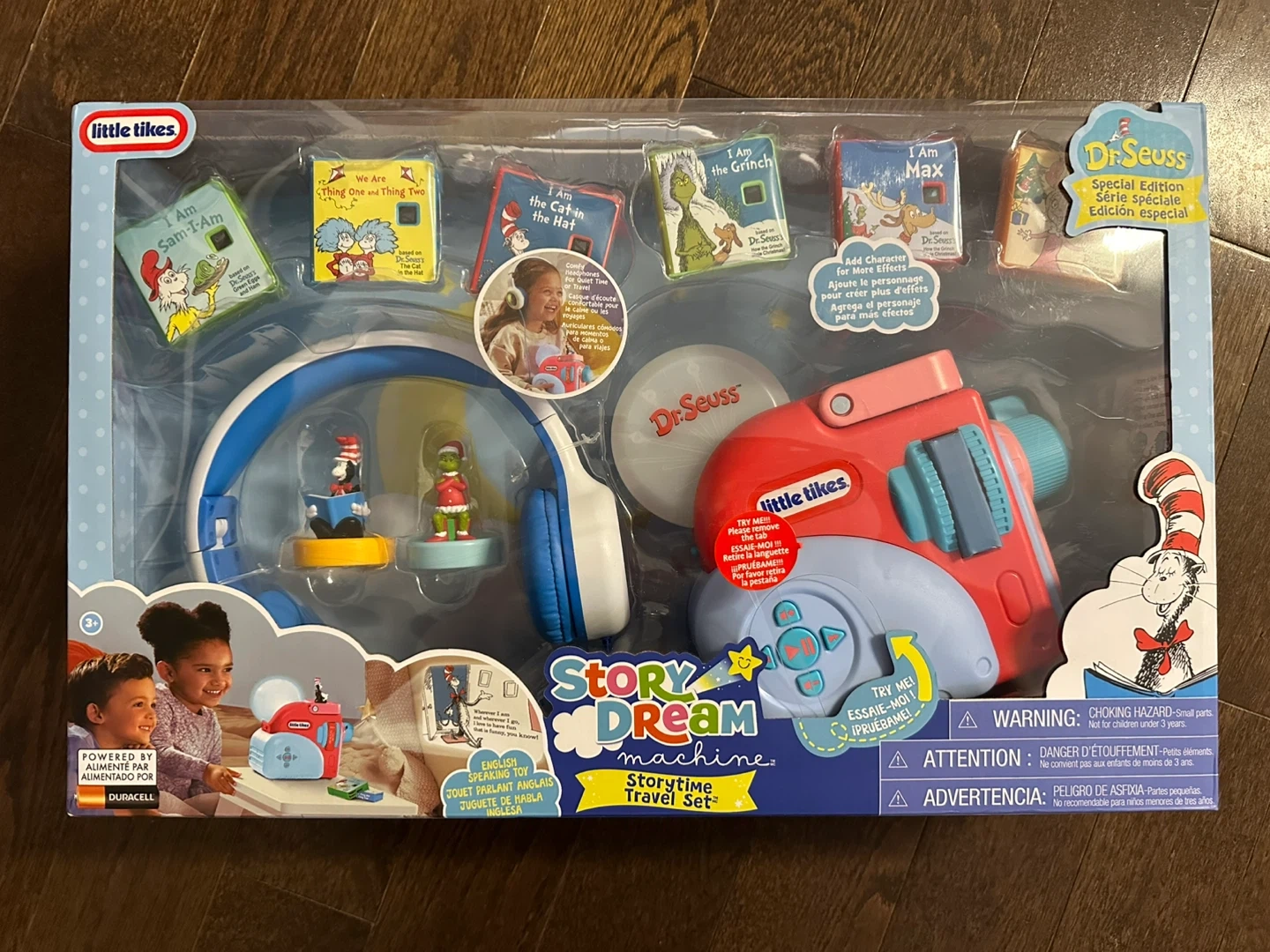 I'm selling a brand new Little Tikes Dr. Seuss Story Dream Machine Storytime Travel Set! It includes the Story Dream Machine, headphones, and several Dr. Seuss mini-books as characters. It's powered by Duracell batteries. Recommended for ages 3+