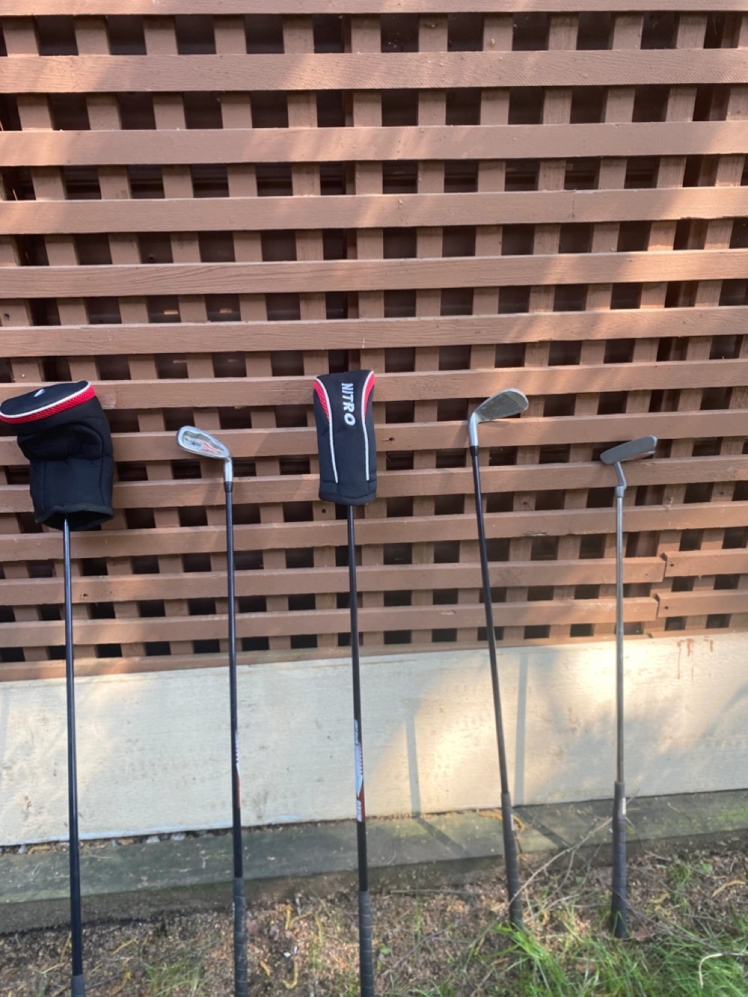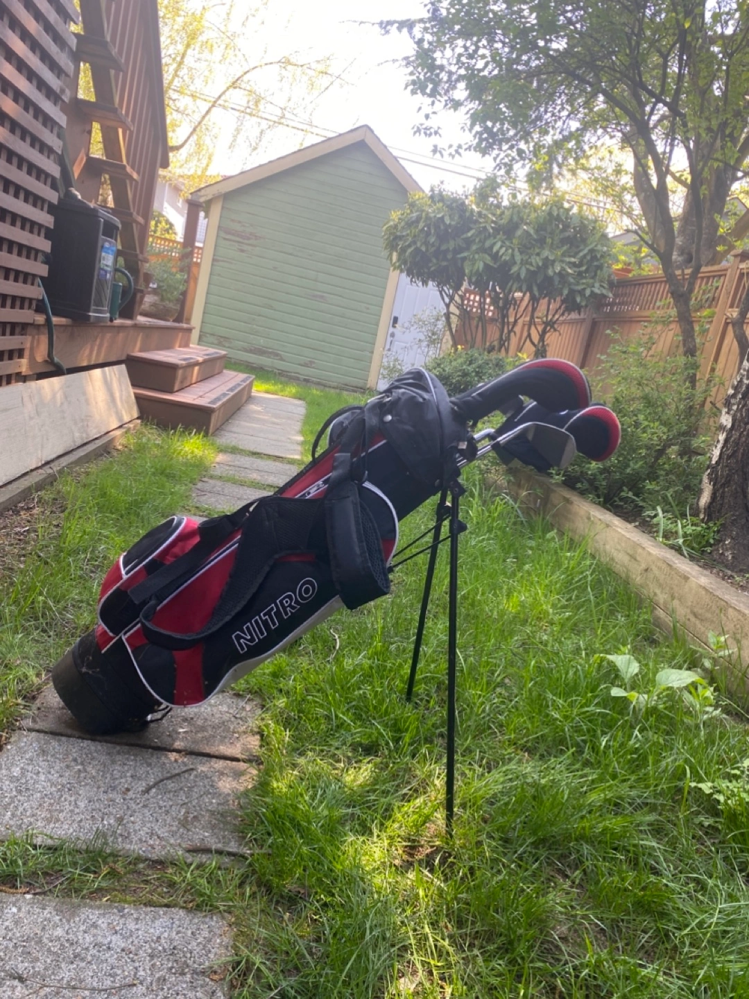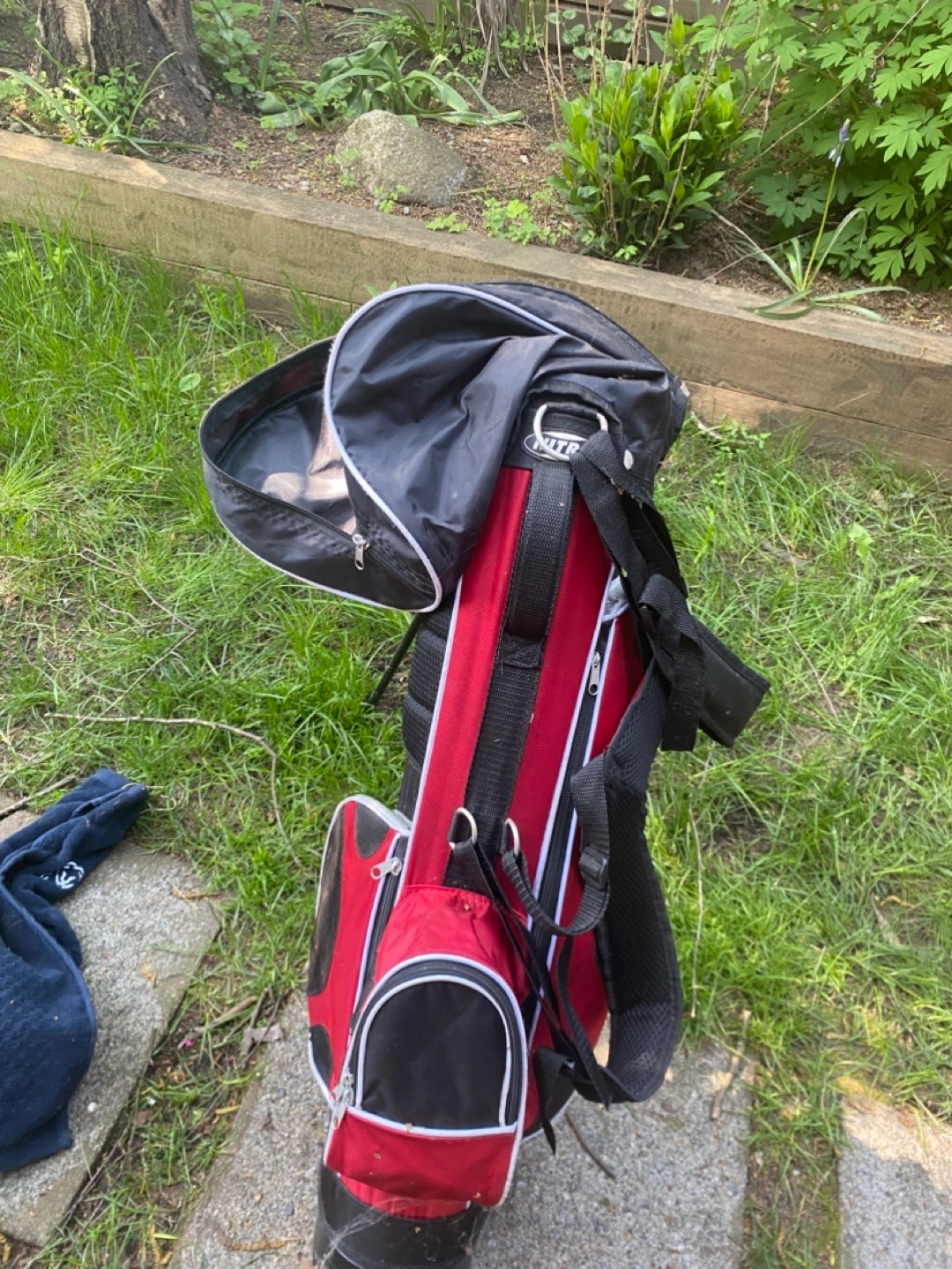 10Junior golf club set. Includes bag and stand with putter, 7 iron, driver, 3 iron and 9 iron. Great for beginners. Clubs show some wear. Also you can have a kids golf glove to.
