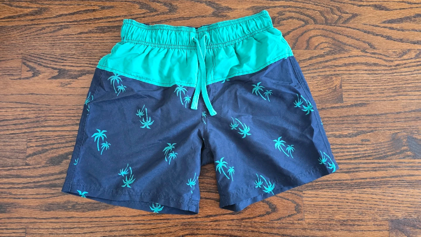 Two pairs of boys swim trunks. One pair features a navy blue colour with green palm tree print and a turquoise waistband. The second pair is navy blue with a colourful print of beach items like umbrellas and popsicles. Both have elastic waistbands with drawstring ties. Size XS, fits 146-152 cm.