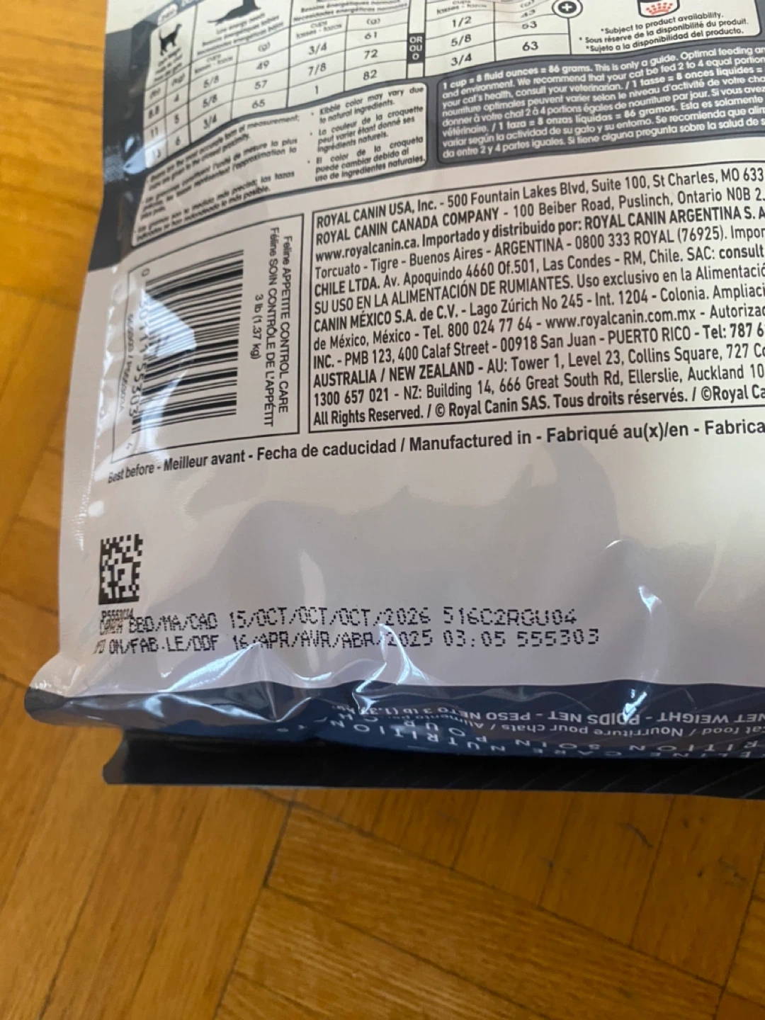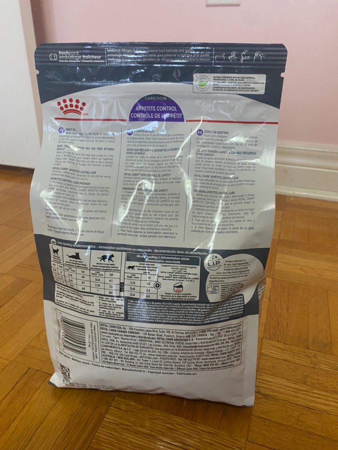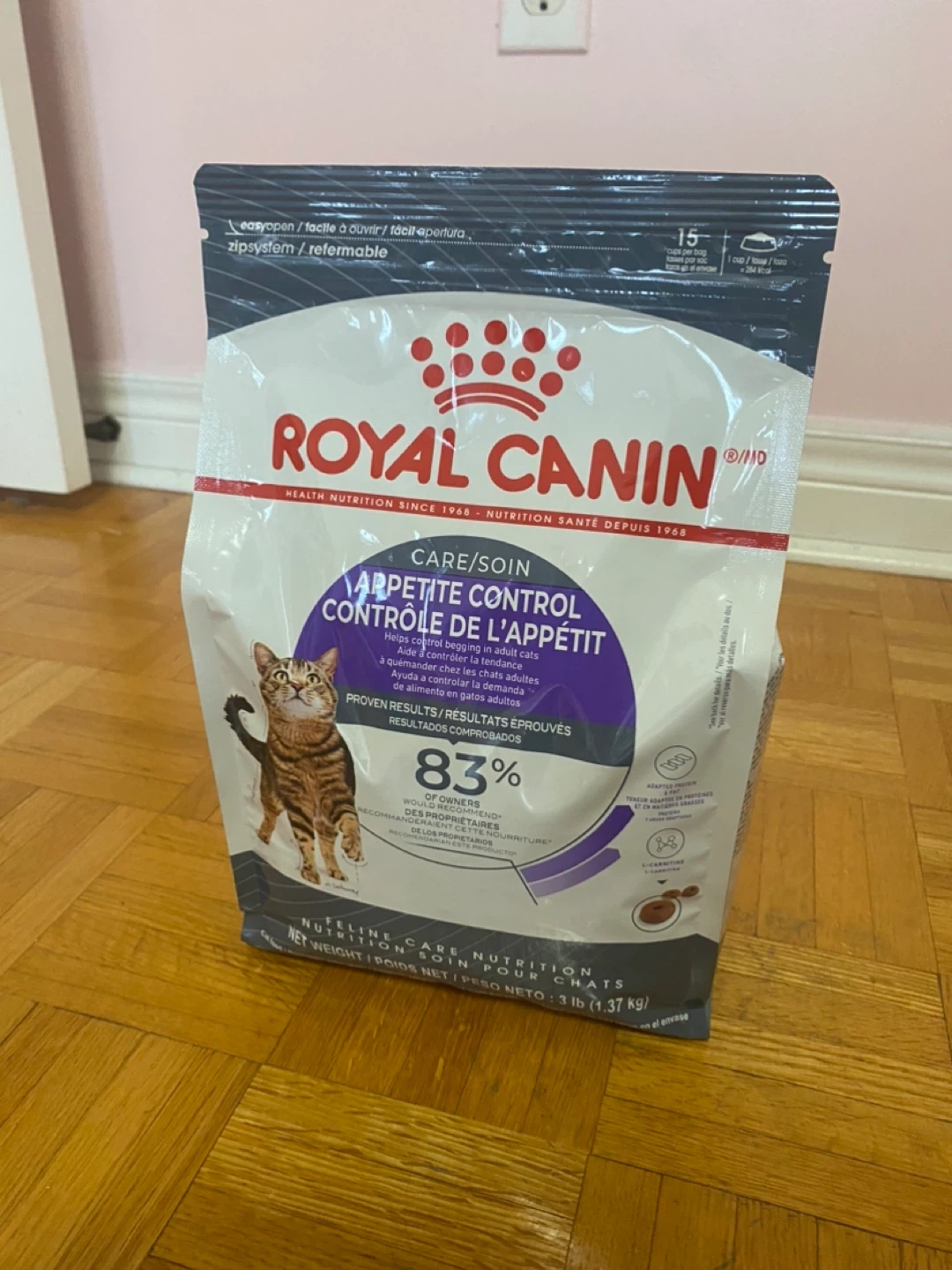 Selling a 3 lb bag of Royal Canin Appetite Control dry cat food. It's designed to help adult cats that beg for food. The expiration date is October 2026