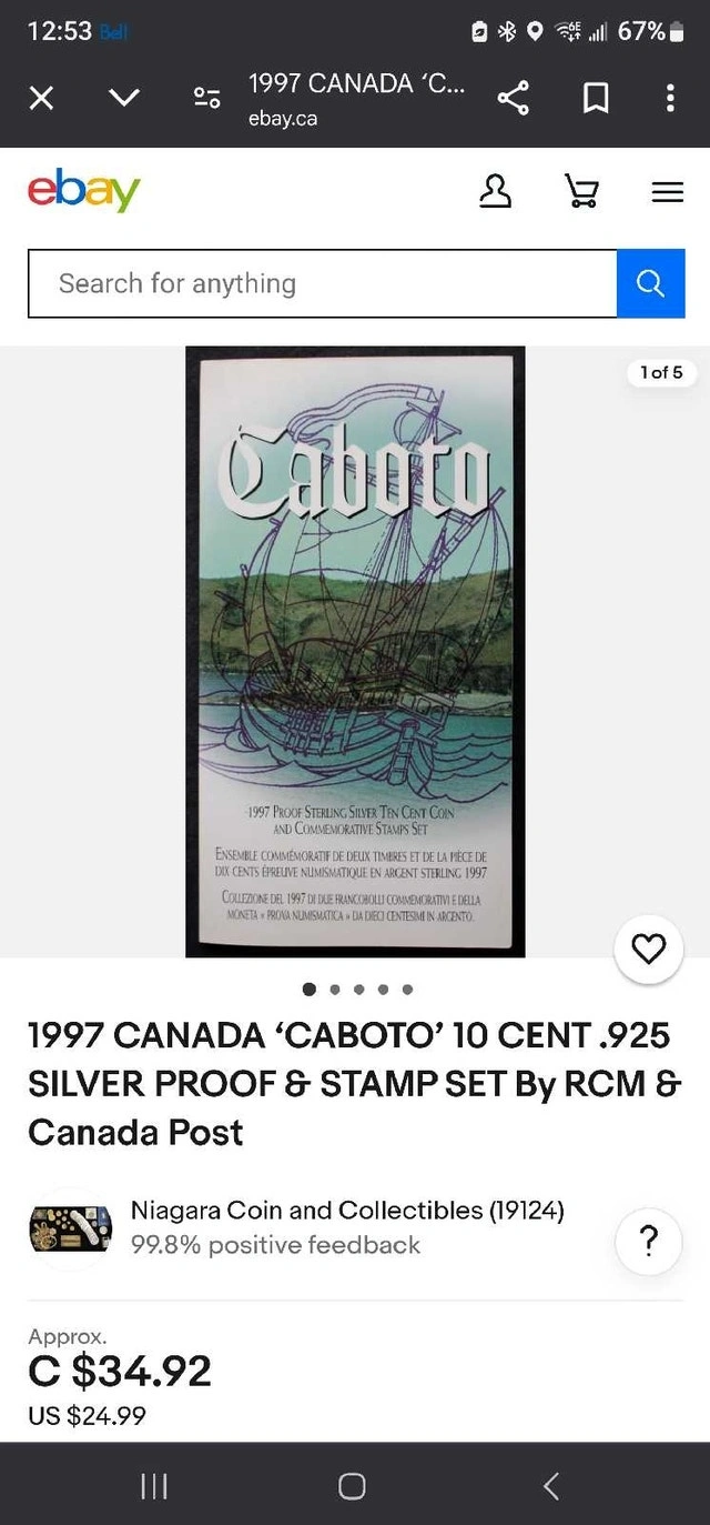 1997 Sterling Silver Caboto 10 Cent Coin & Stamps