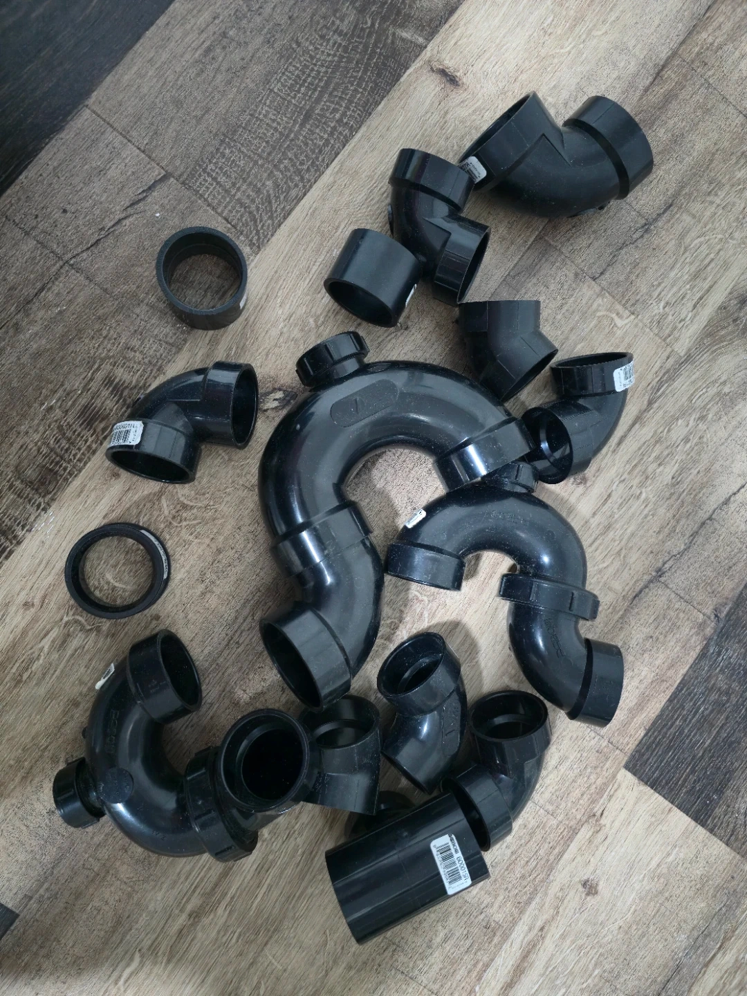 This is a collection of assorted black PVC plumbing fittings. Includes various elbows, couplings, and other connectors. These are standard PVC pipes and fittings for plumbing projects.