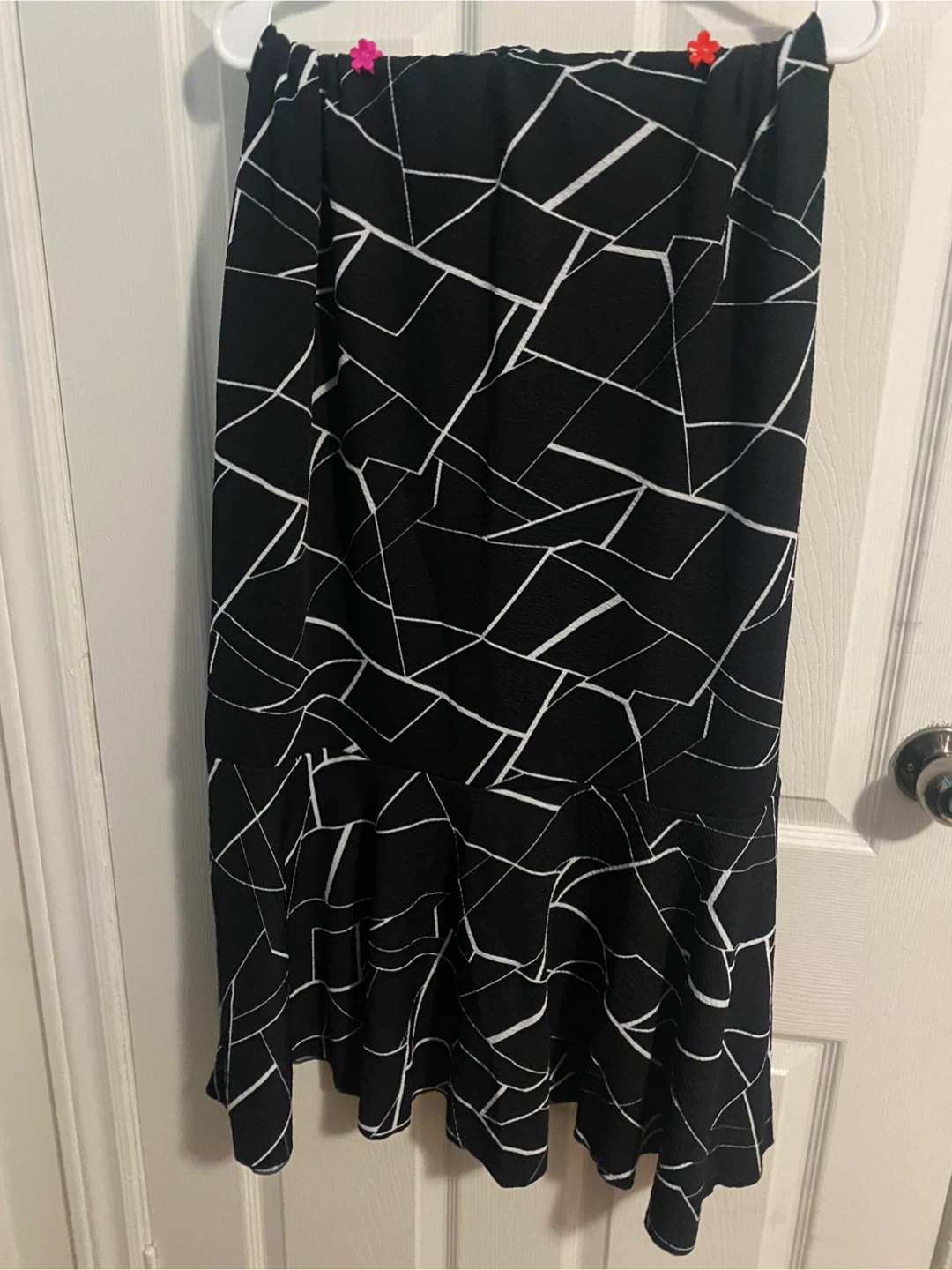 This skirt features a black base with a white abstract geometric pattern. It has an elastic waistband and a ruffled hemline. The material is lightweight and flowy.