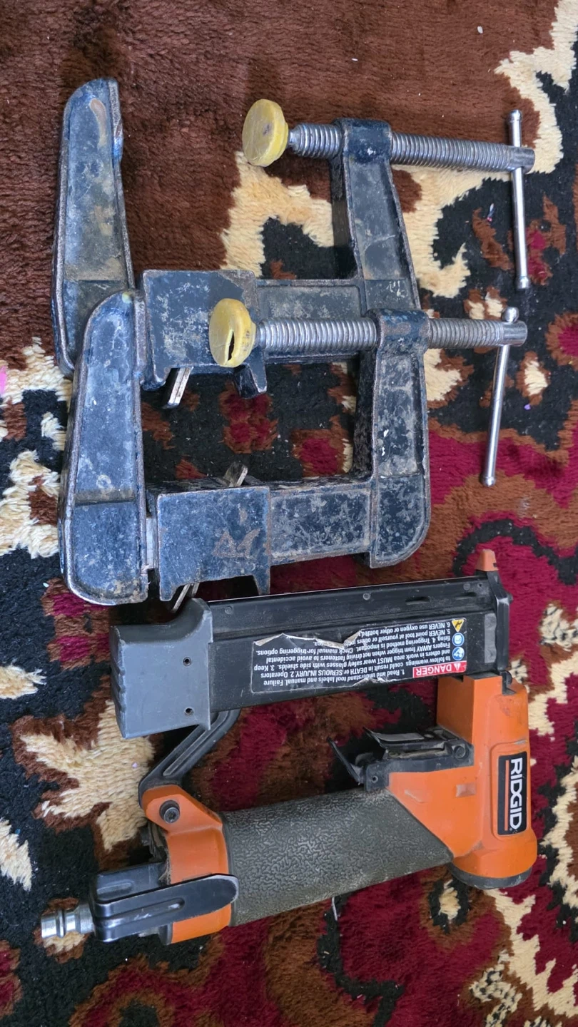 This listing includes a Rigid pneumatic nail gun and two C-style clamps. The nailer is orange and grey, with a metal and plastic construction. The clamps are black with yellow rubber protective caps on the screw ends.