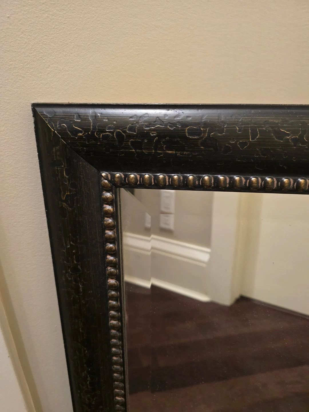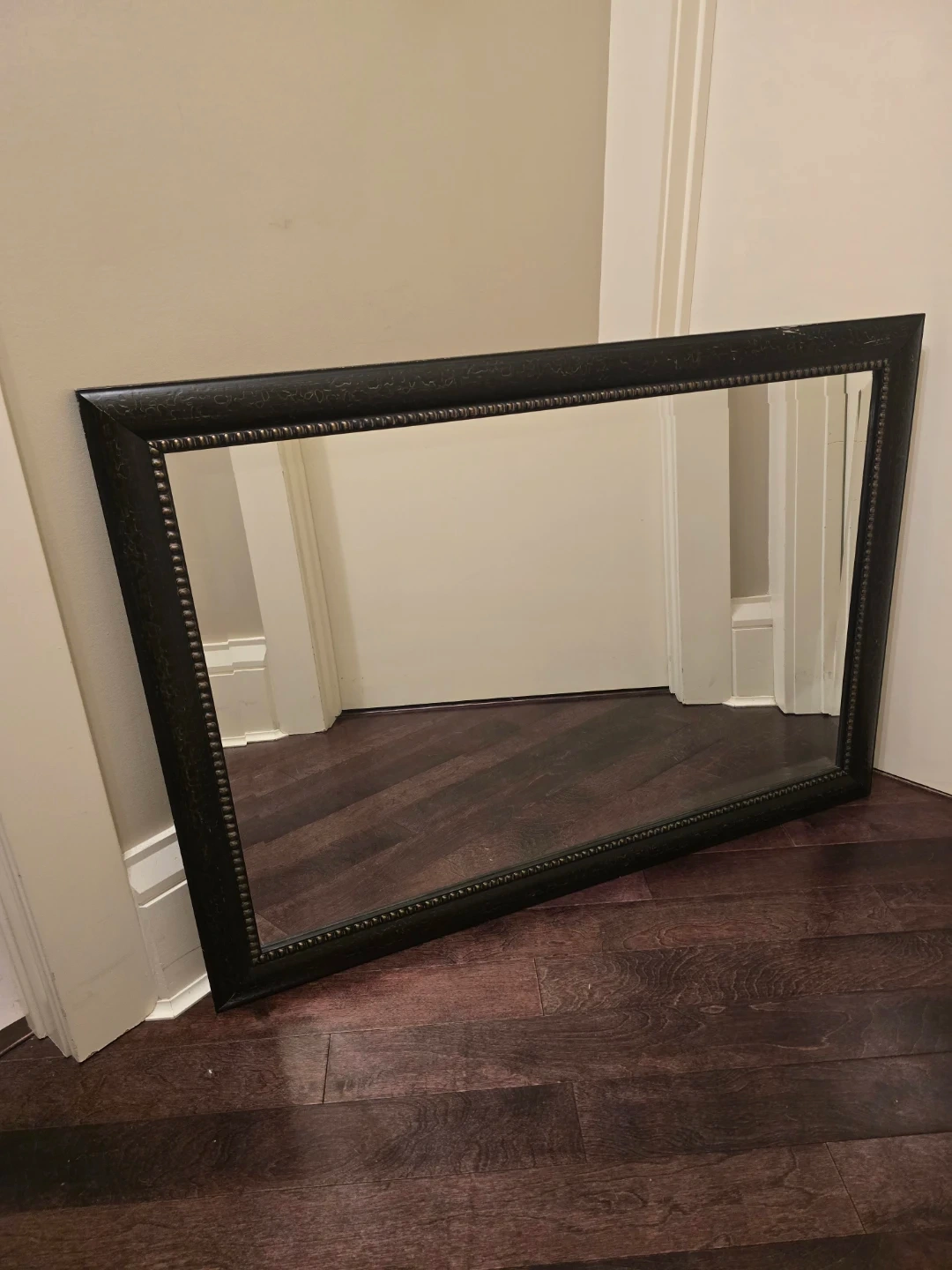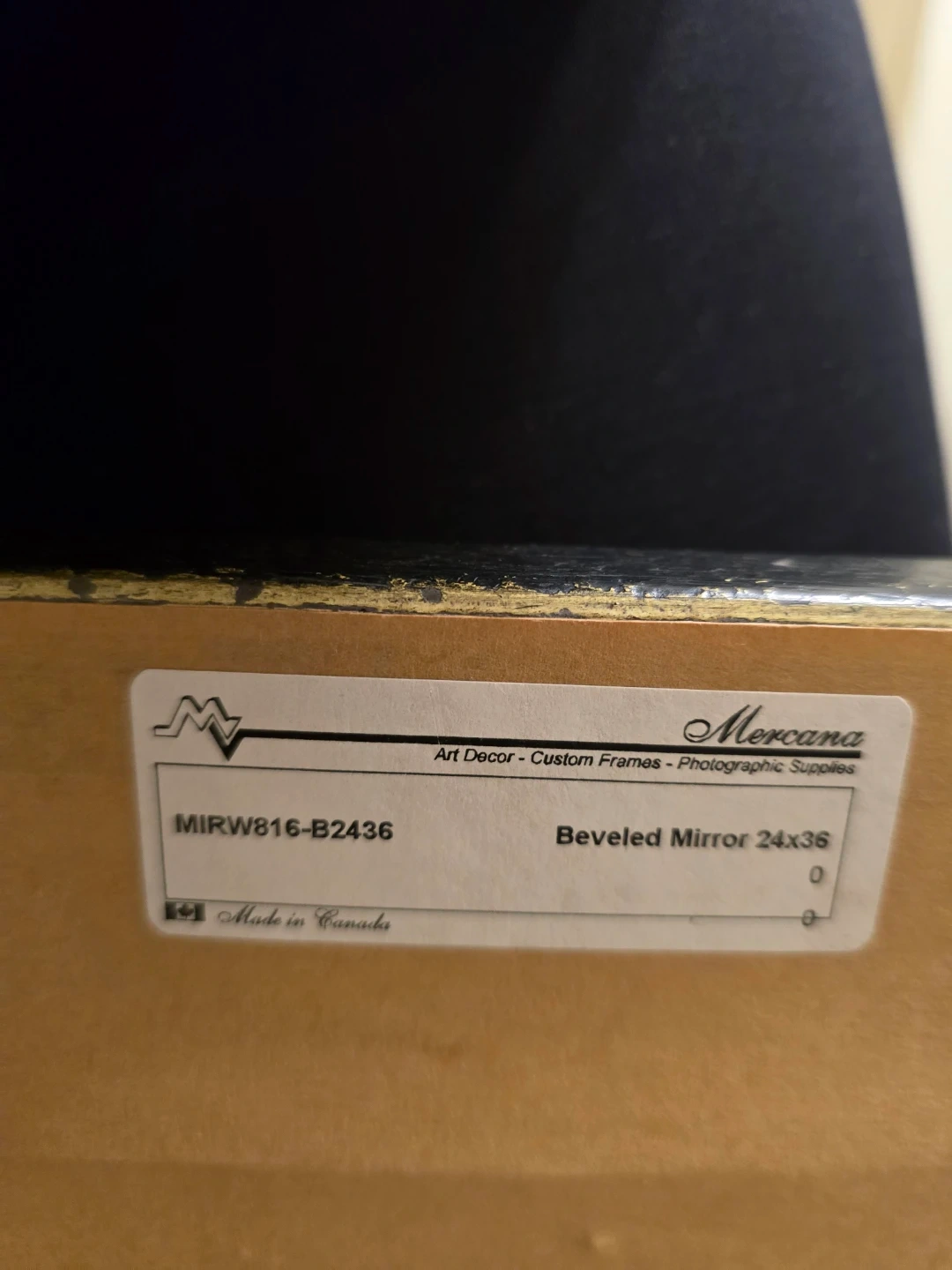 This is a Mercana beveled mirror, measuring 24x36 inches. It features a decorative black frame with gold distressing. Made in Canada.