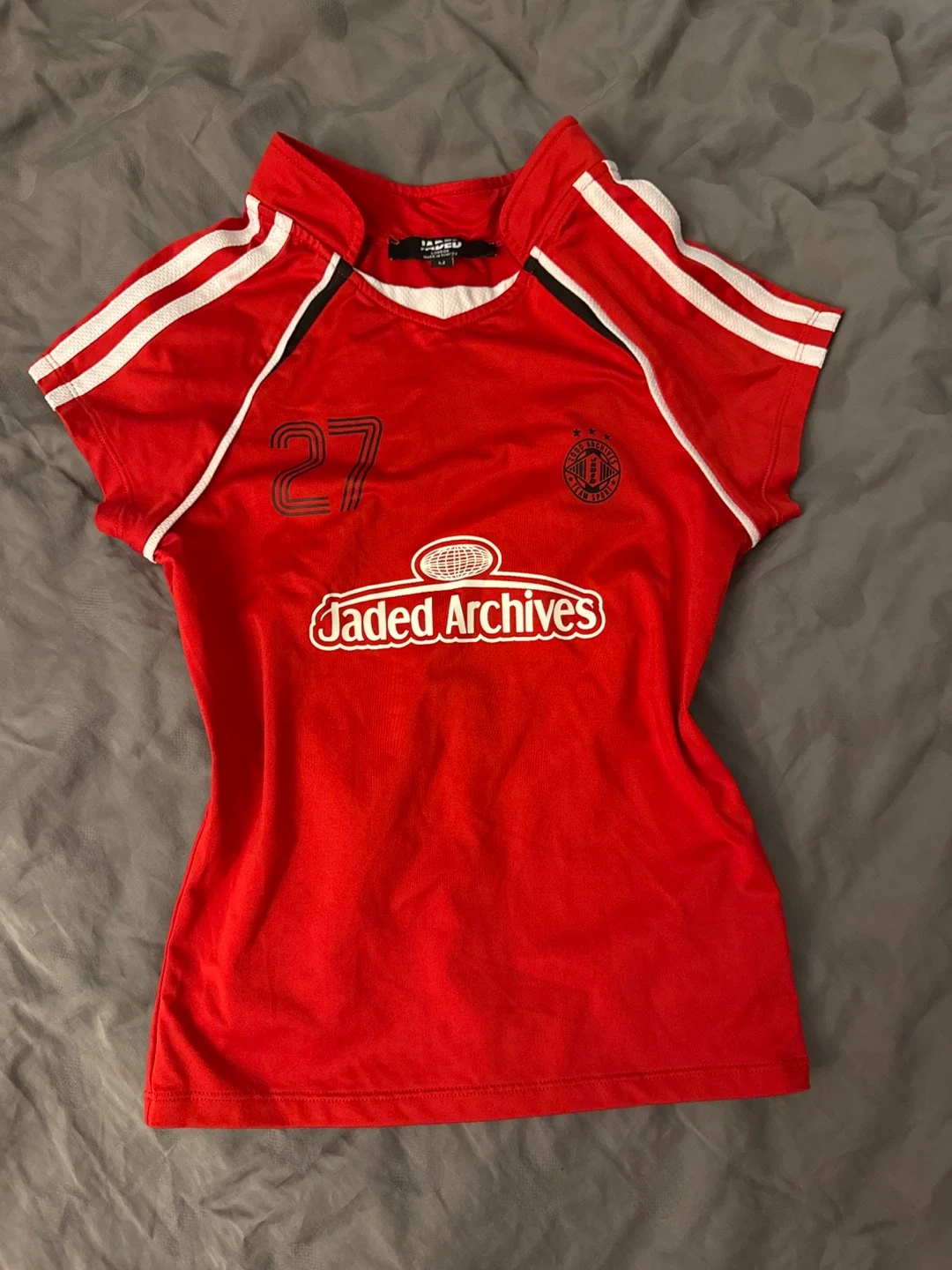 This is a Jaded Archives Sport jersey t-shirt in red. It's a size medium and made in Turkey. It features the number 27 on the front.