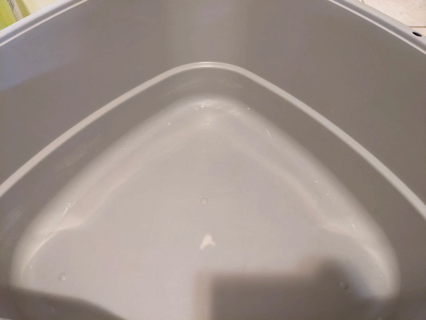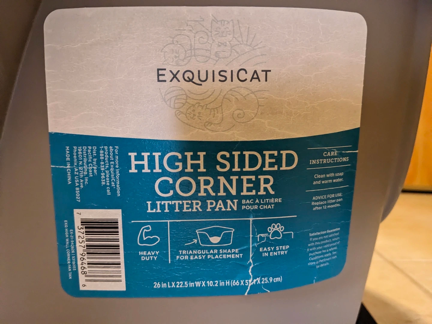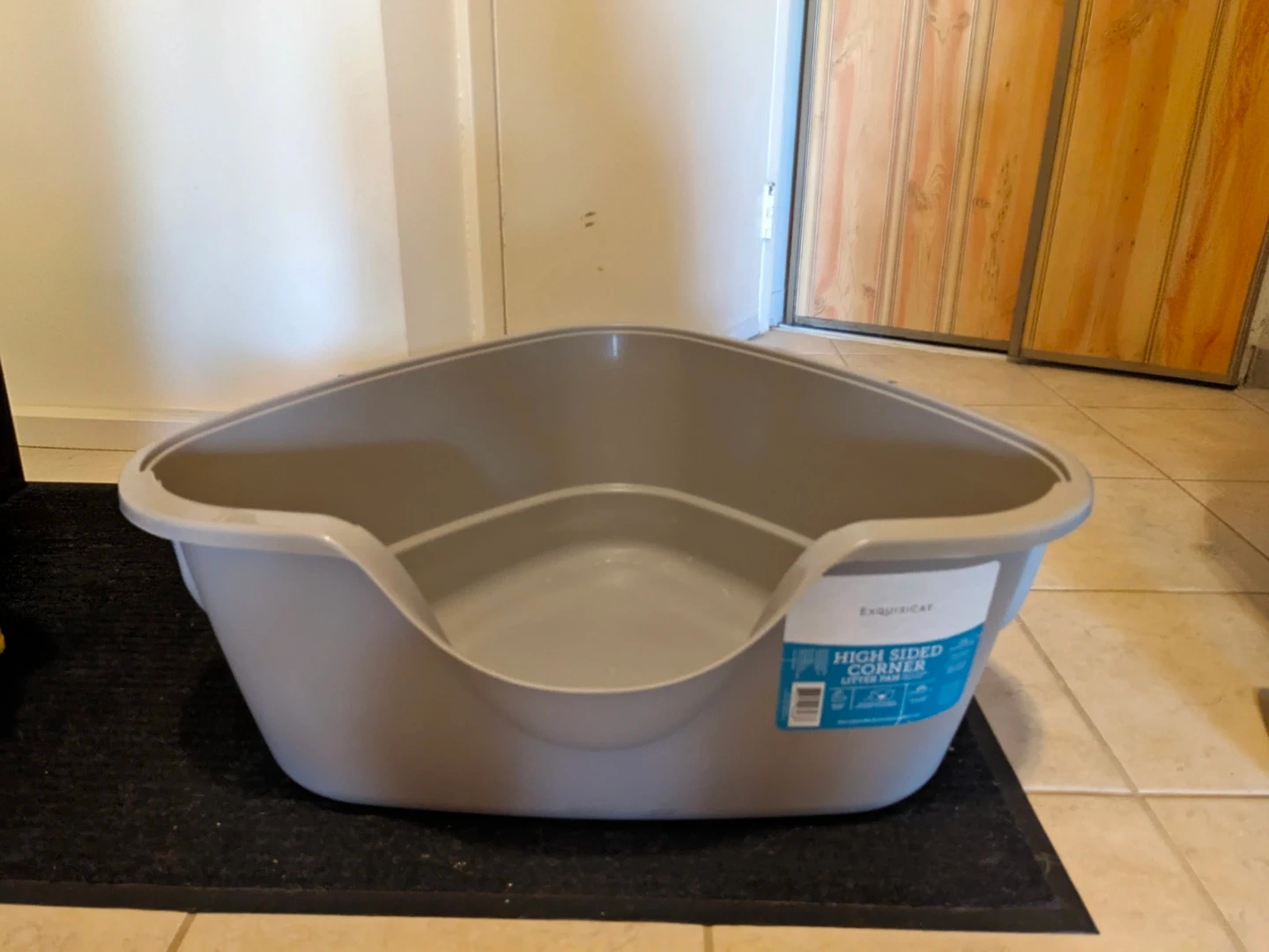 This is an ExquisiCat high sided corner litter pan. It's designed for easy step in entry. The pan has a triangular shape for easy placement. Has been cleaned and sterilized
