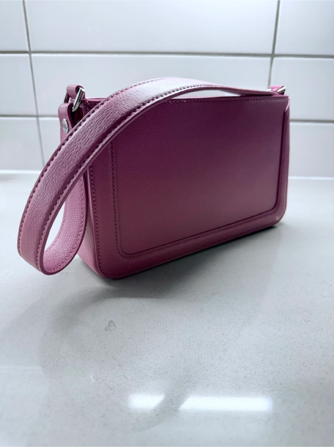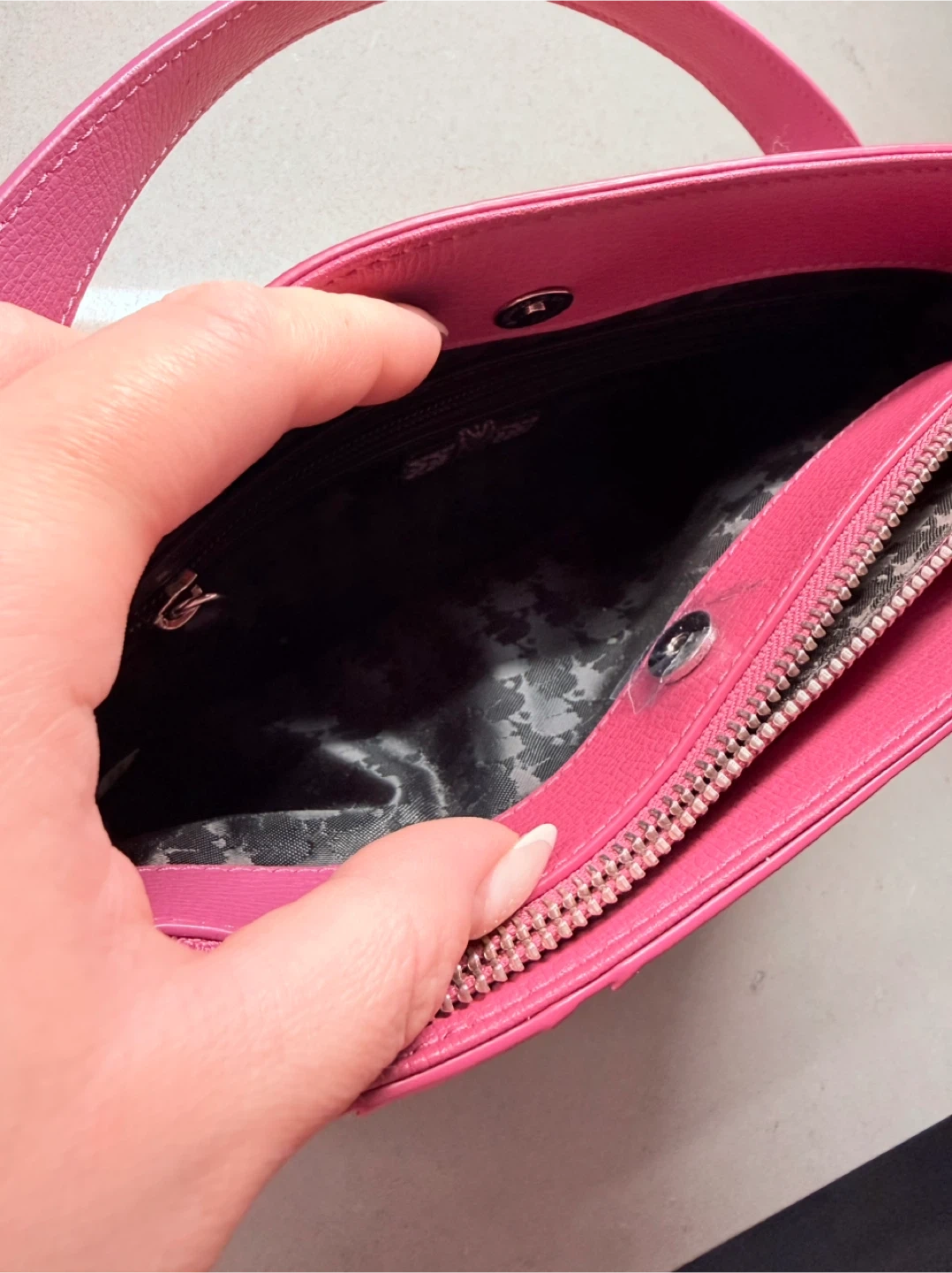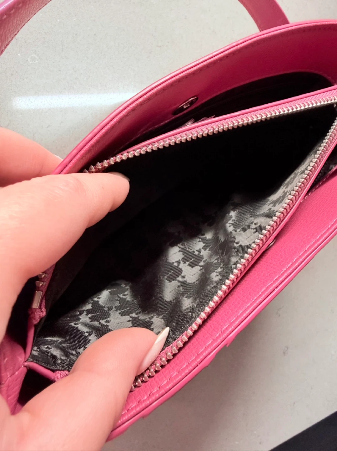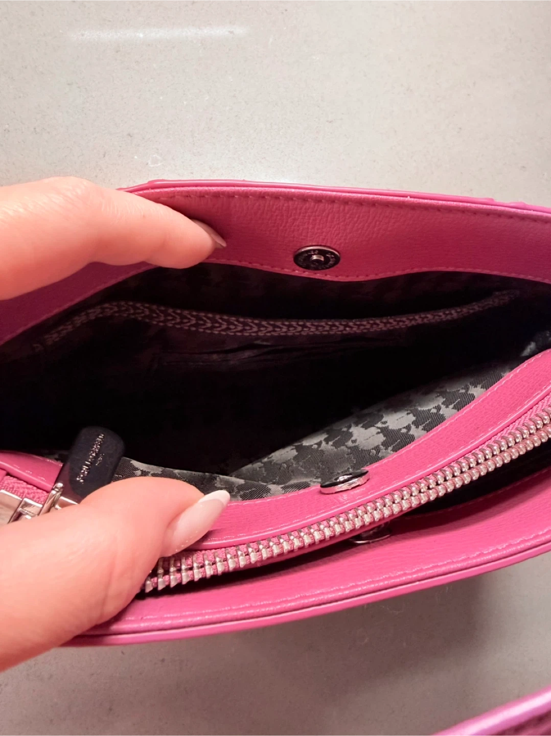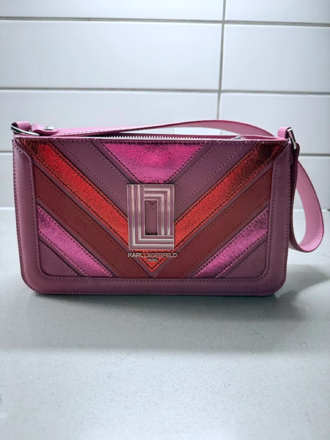 This Karl Lagerfeld Paris crossbody bag is in excellent condition, featuring a unique pink colour-block chevron design and silver hardware. It's perfect for adding a pop of colour to any outfit! The bag includes a secure zip closure and a compact interior, ideal for your essentials.
