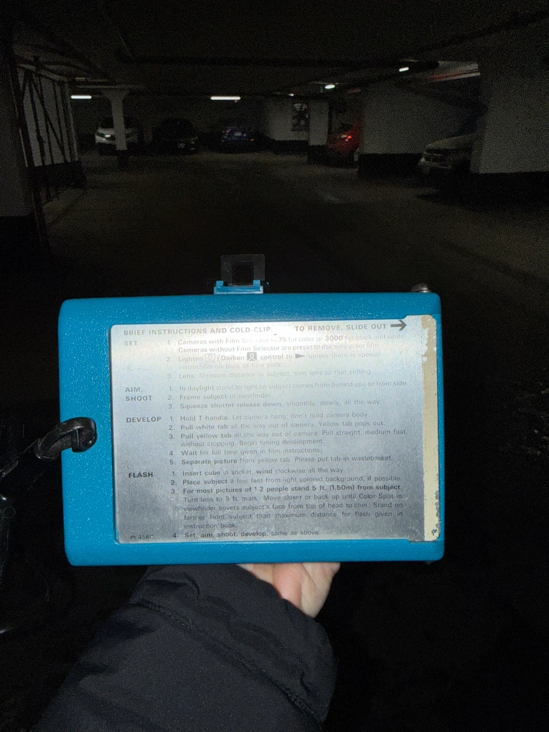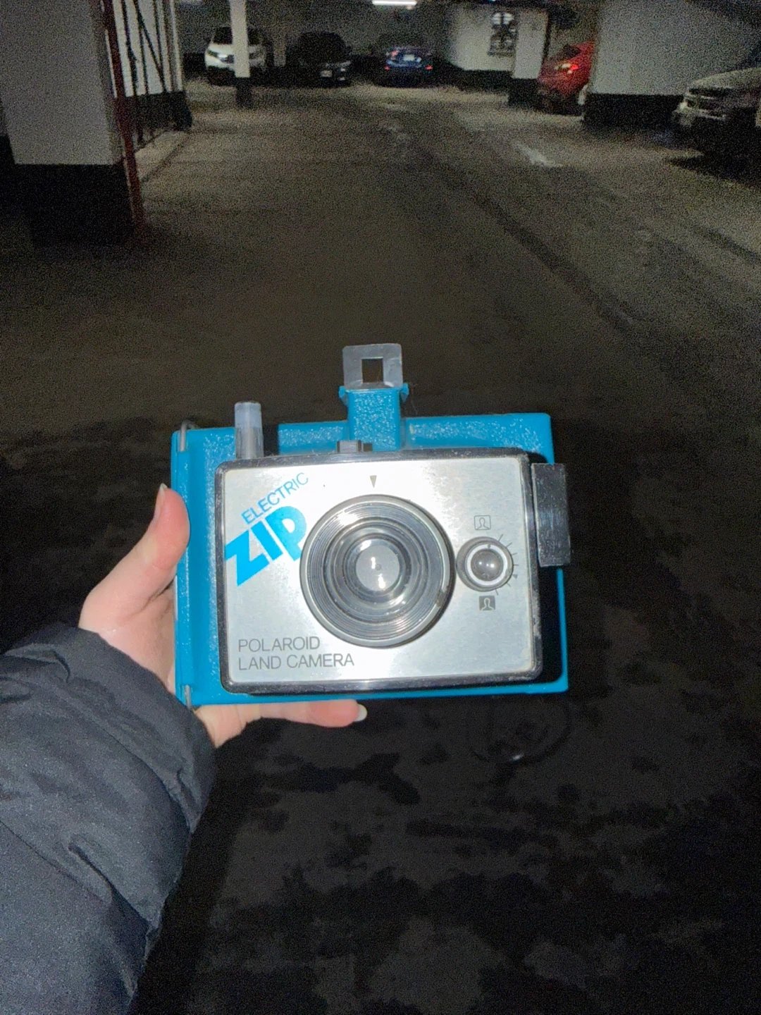 This is a Polaroid Electric ZIP Land Camera in bright blue. It's a vintage instant camera. This camera uses Polaroid's line of instant film packs.