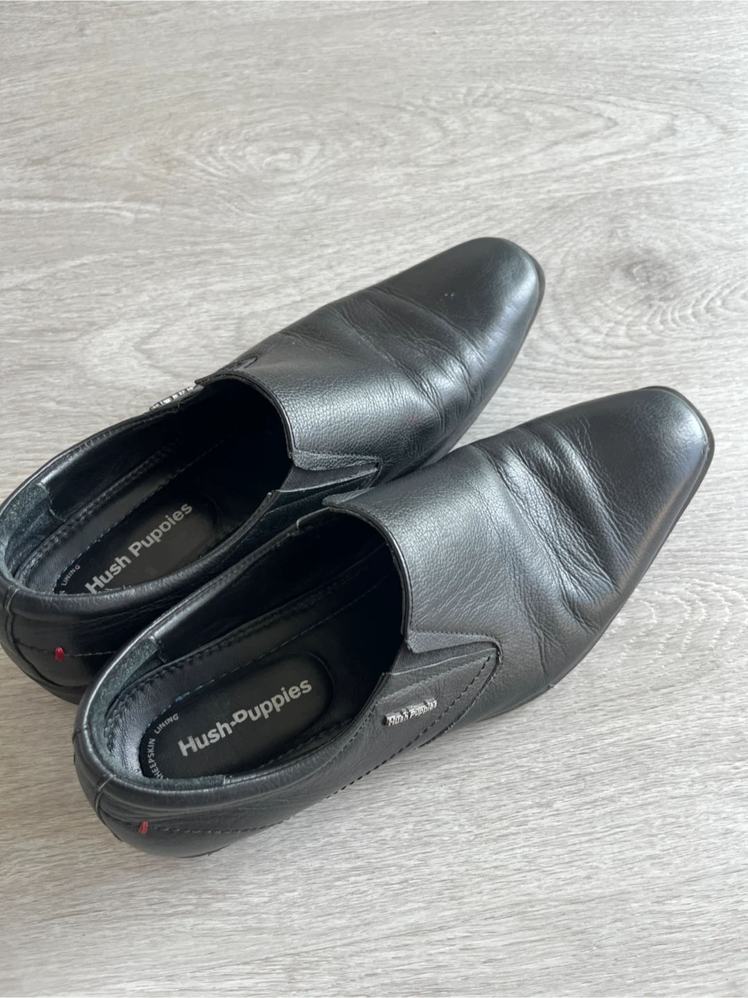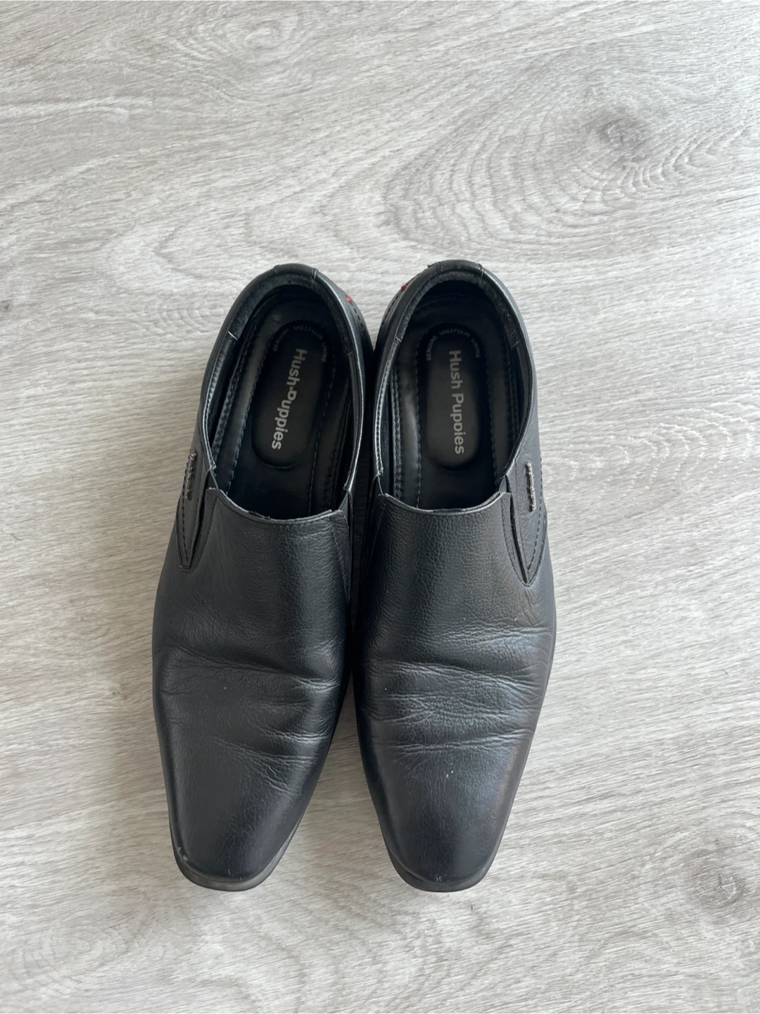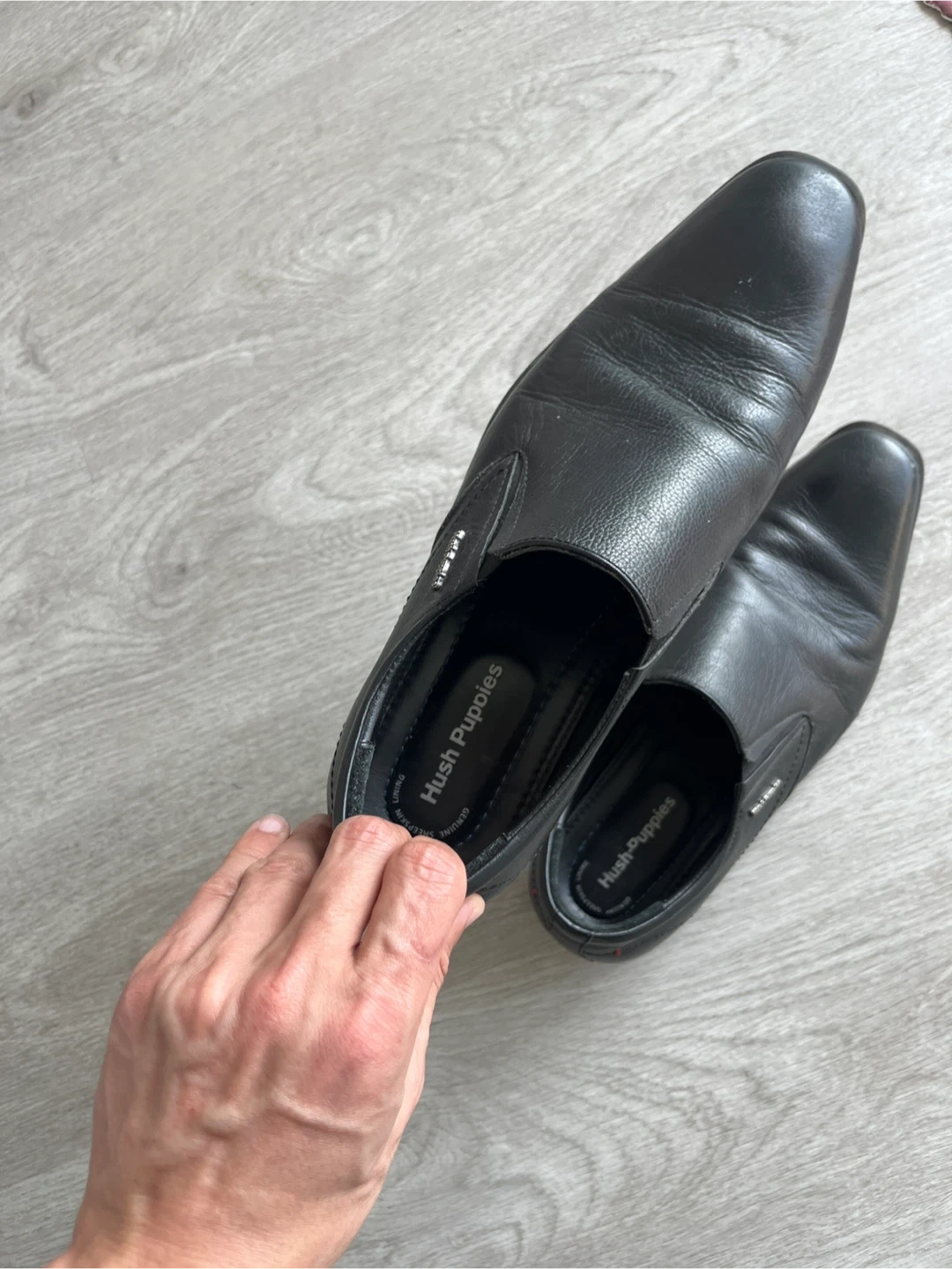 Classic black leather slip-on dress shoes from Hush Puppies. These shoes are made with genuine leather sheepskin and feature a comfortable slip-on design. They're perfect for work or casual occasions.