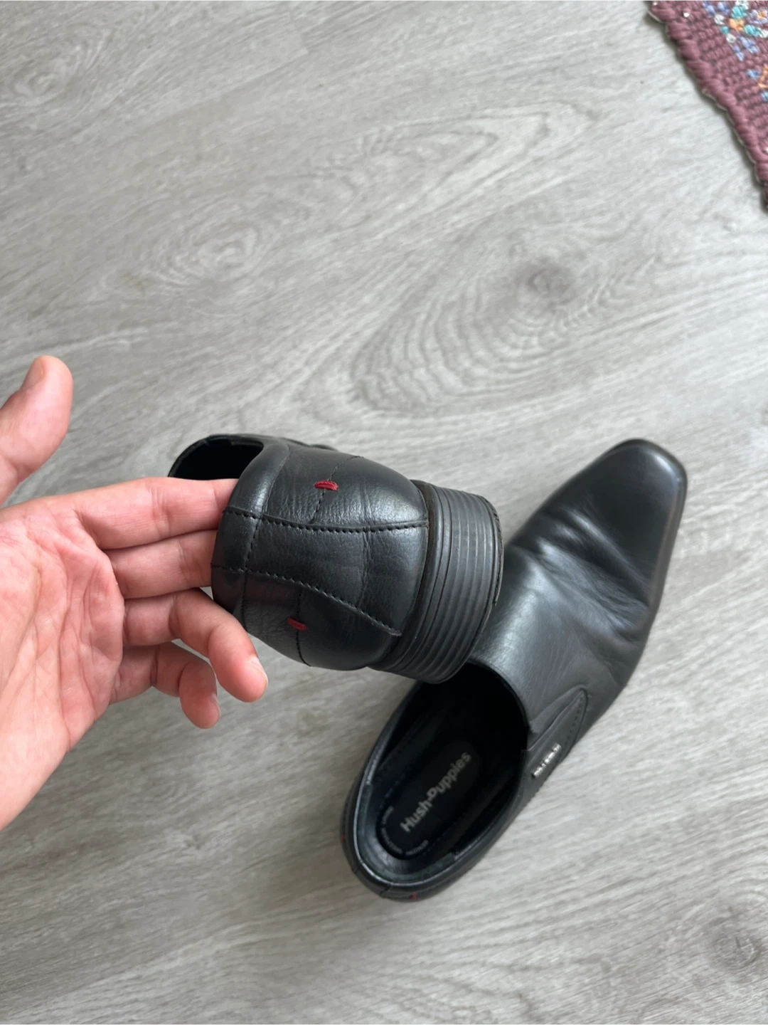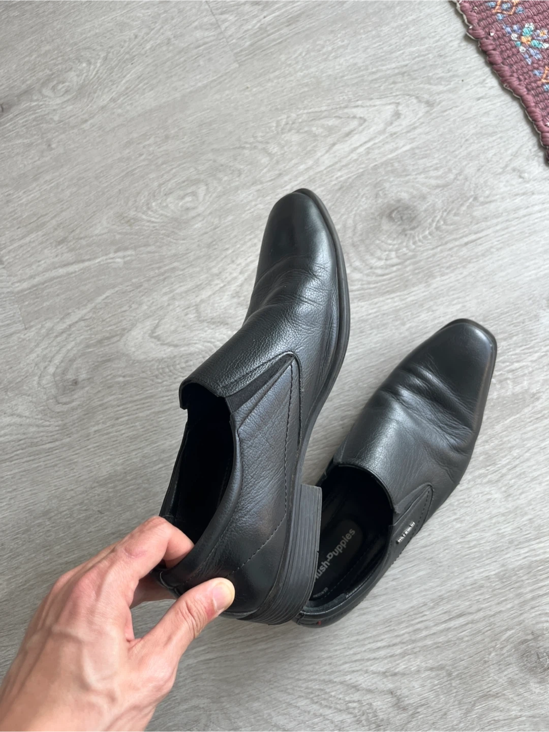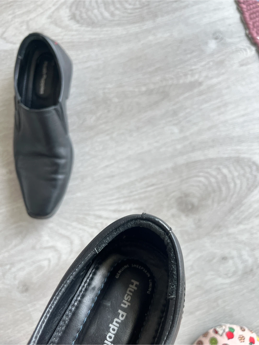 Classic black leather slip-on dress shoes from Hush Puppies. These shoes are made with genuine leather sheepskin and feature a comfortable slip-on design. They're perfect for work or casual occasions.