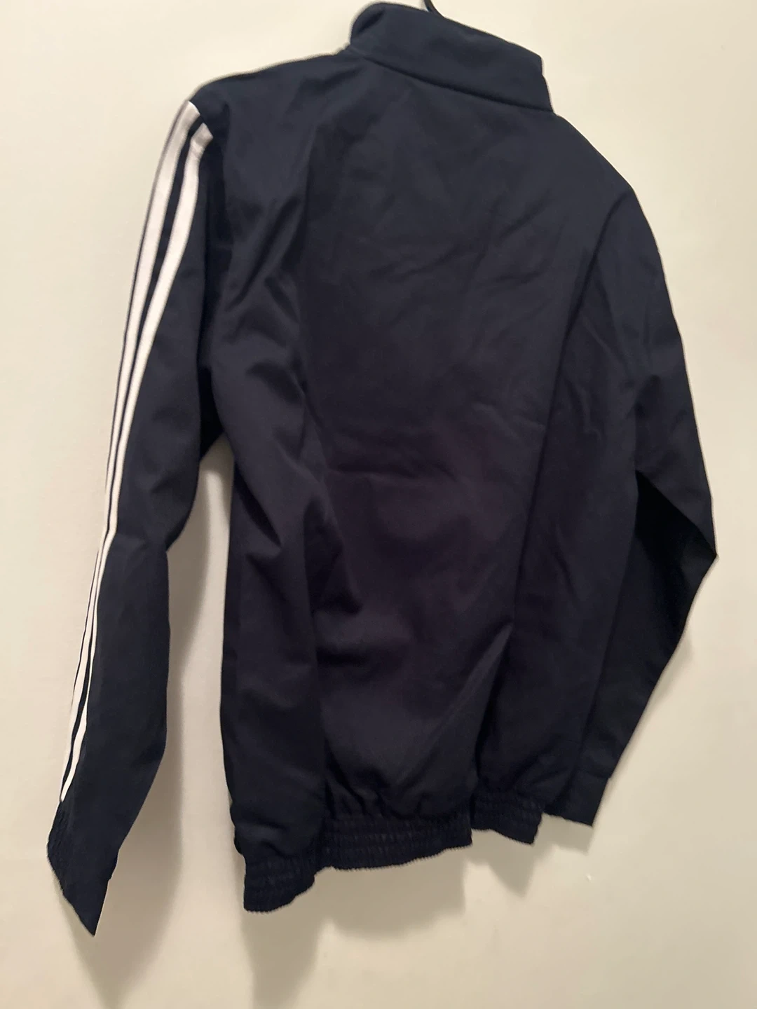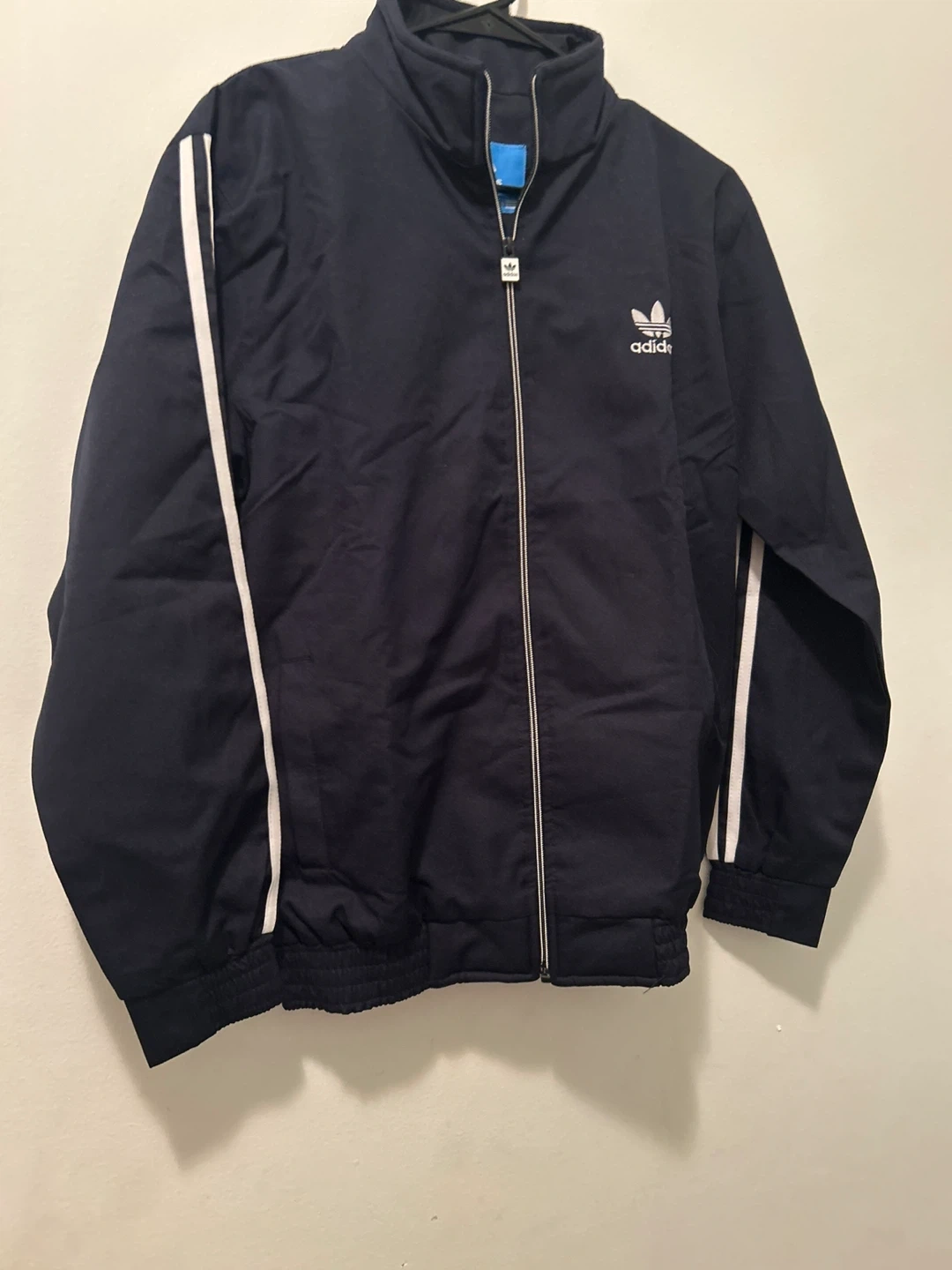 Classic Adidas tracksuit set in navy blue. Includes a full-zip jacket and matching track pants with iconic three stripes. Perfect for casual wear or athletic activities.