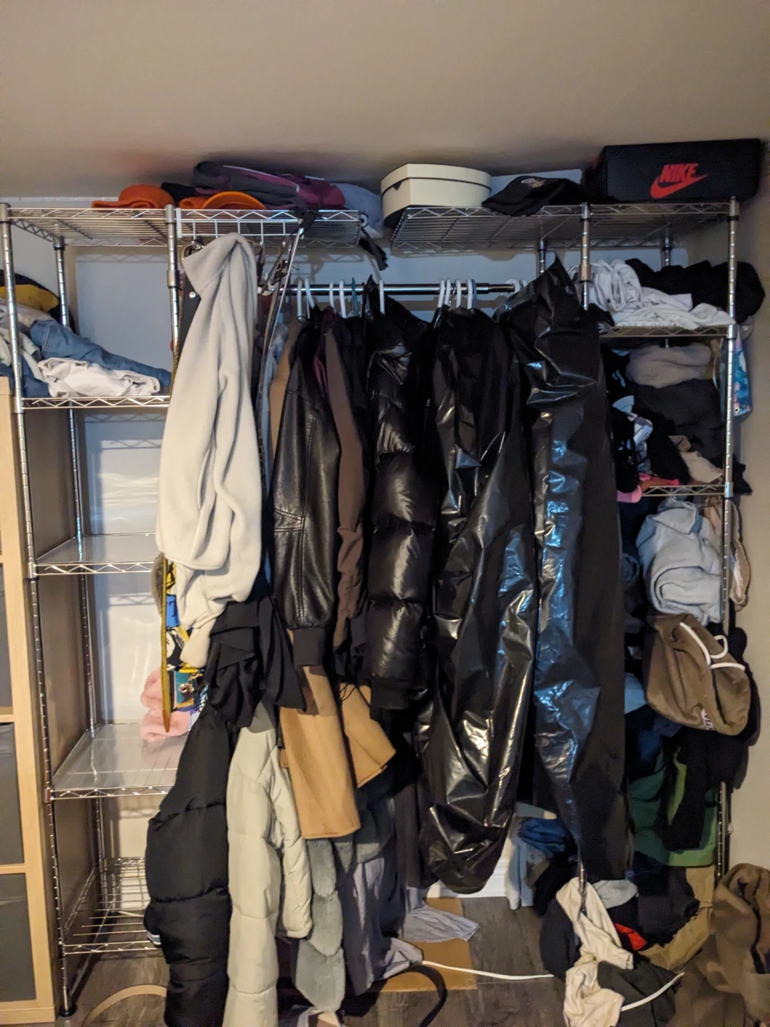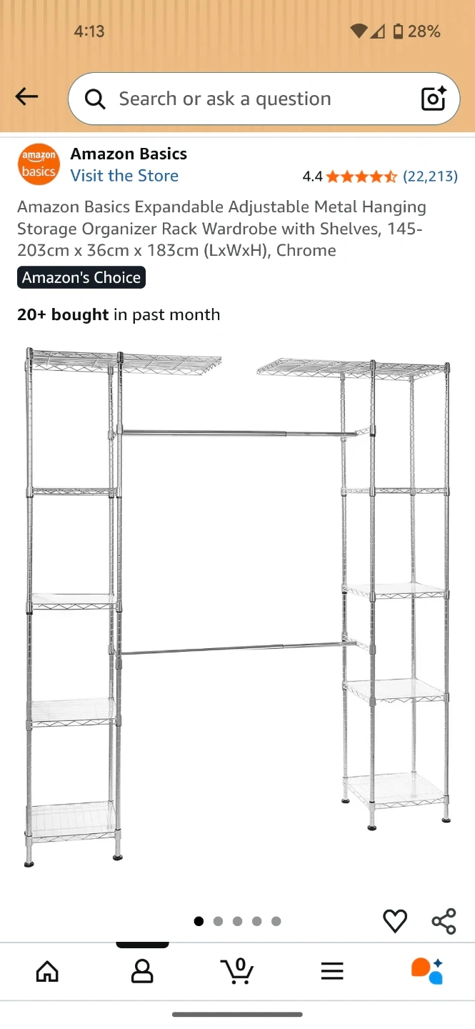 This is an Amazon Basics expandable metal hanging storage organizer rack. It's a chrome finish with shelves. The adjustable size is 145-203cm x 36cm x 183cm (LxWxH). This unit would be useful for organizing clothes and accessories.