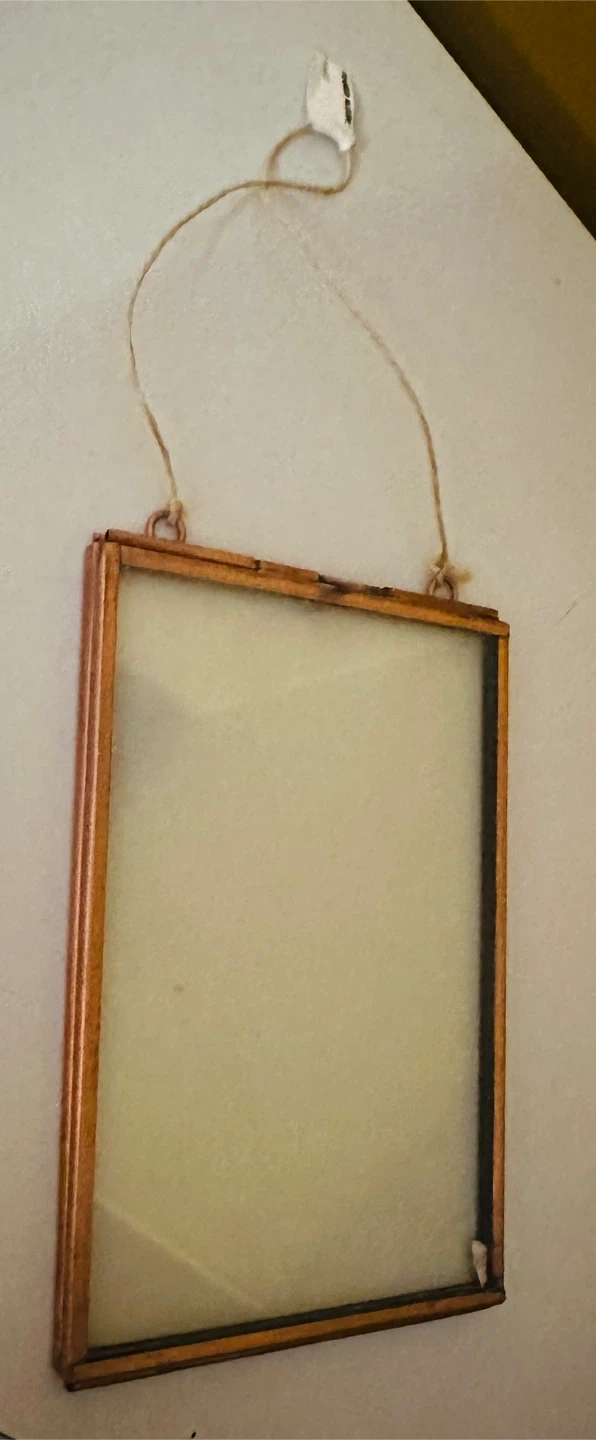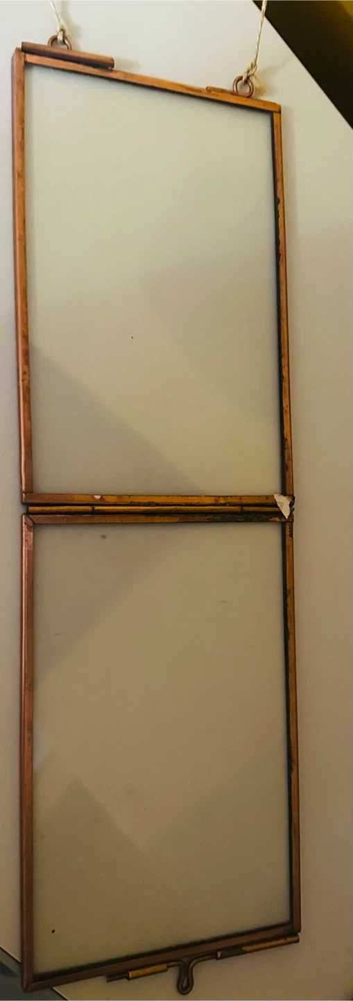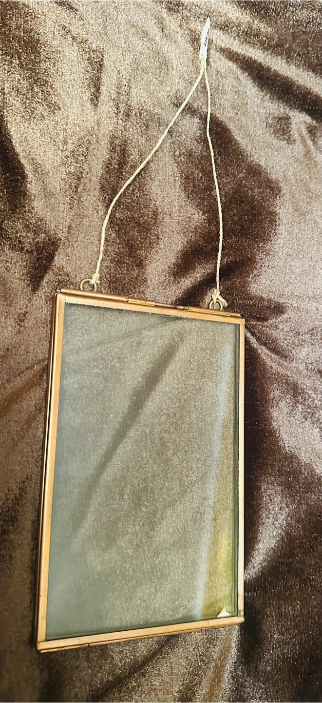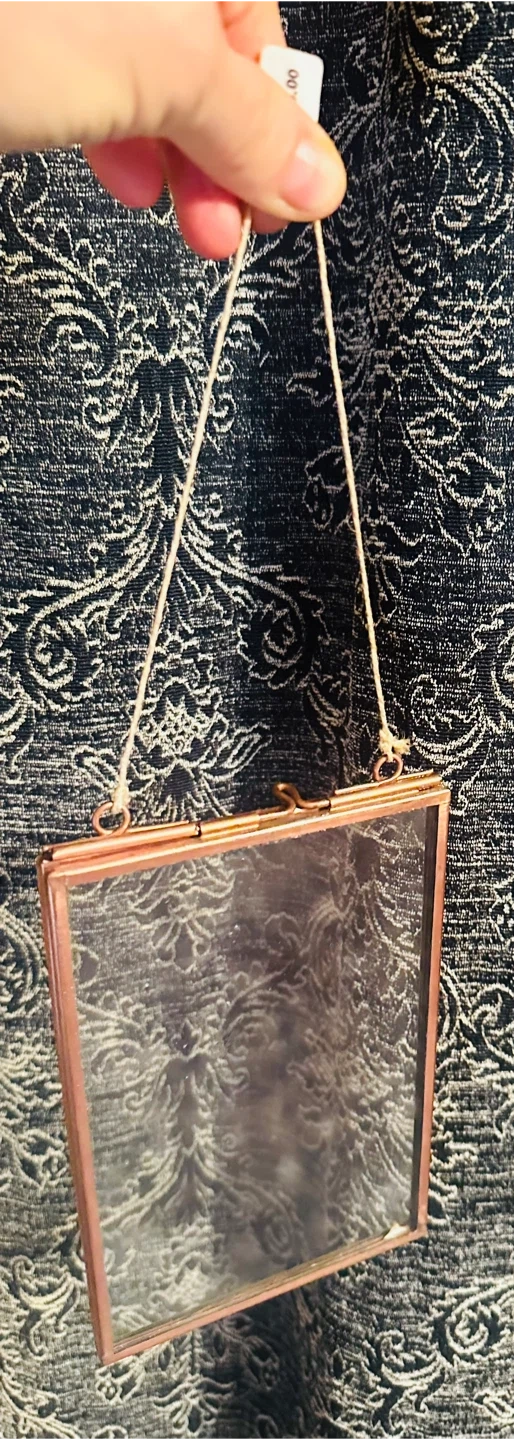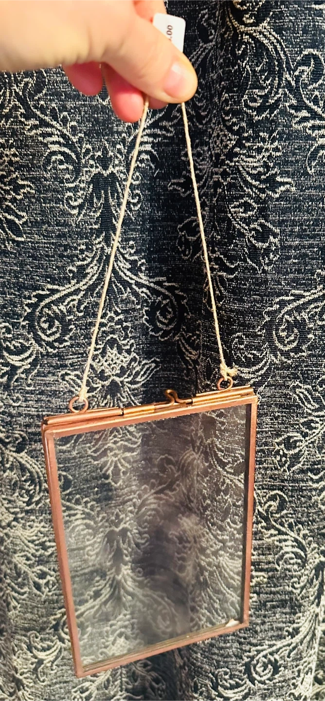 This is a decorative hanging photo frame. It's made with a copper-toned metal frame and clear glass panels. The frame has a rope for hanging. It's suitable for displaying photos or small mementos.
