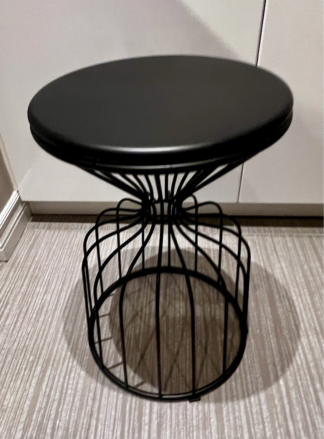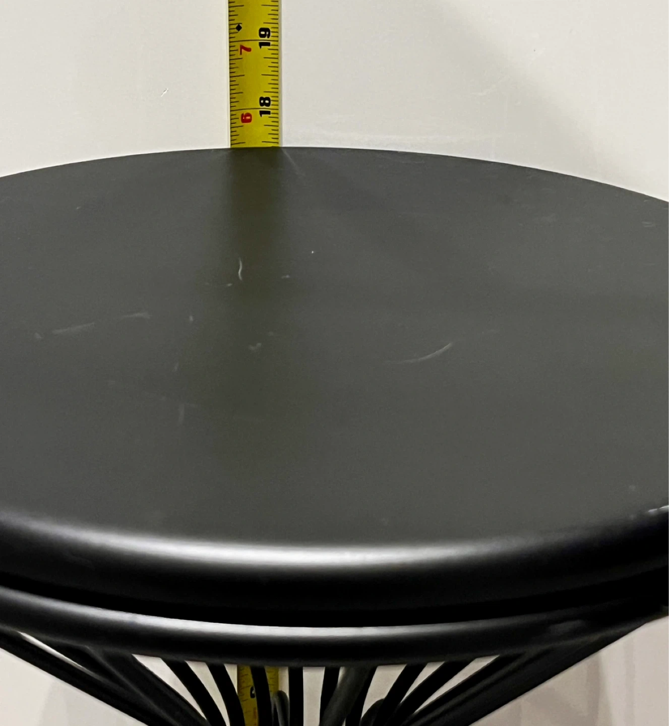 Black metal accent table with a wire cage base. Top diameter is about 12 inches, and it's around 18 inches tall. This table adds a stylish touch to any room!