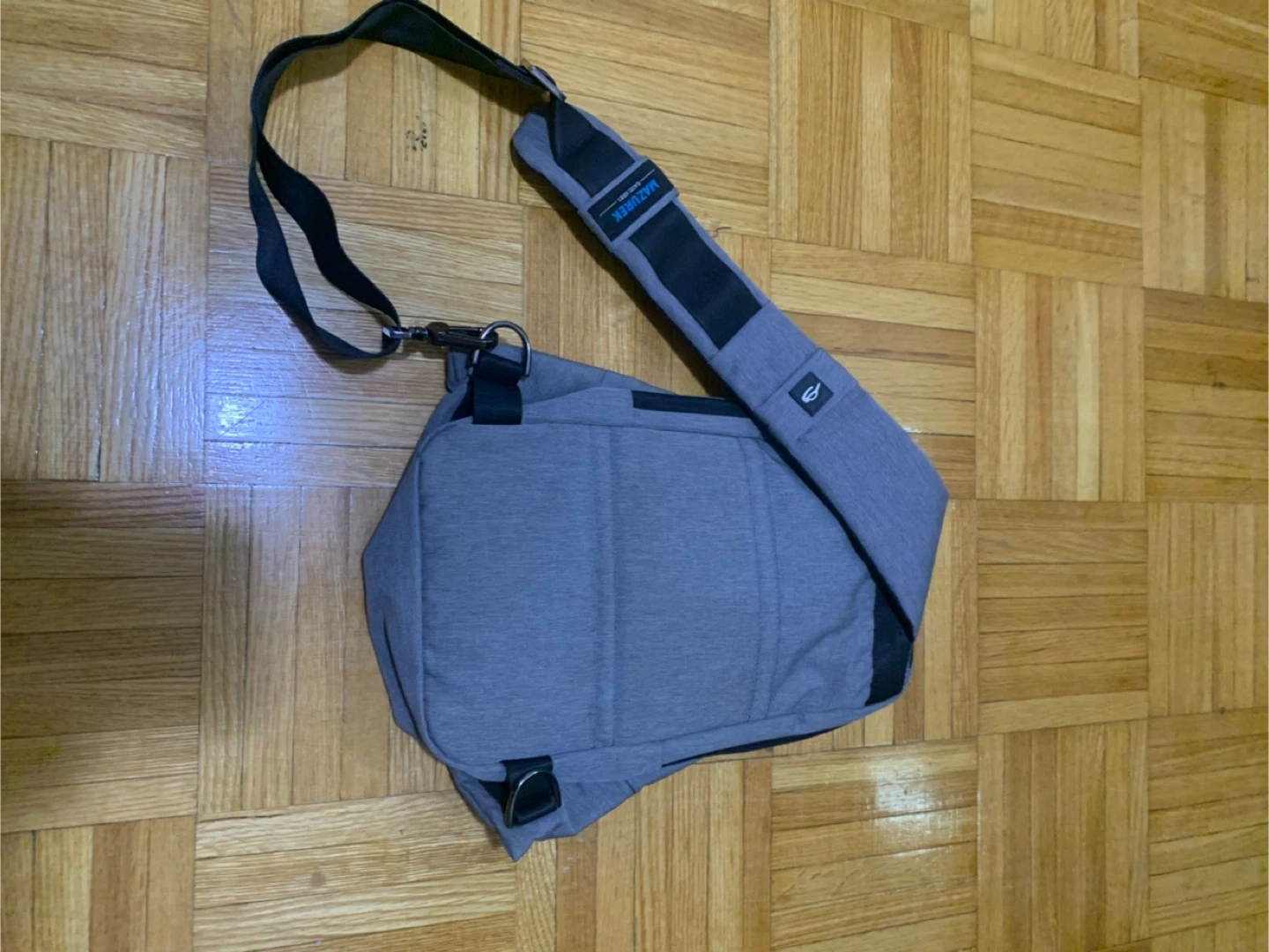 This is a grey MATERIX sling bag. It's made of durable fabric with an adjustable strap. Multiple pockets offer convenient storage for daily essentials.