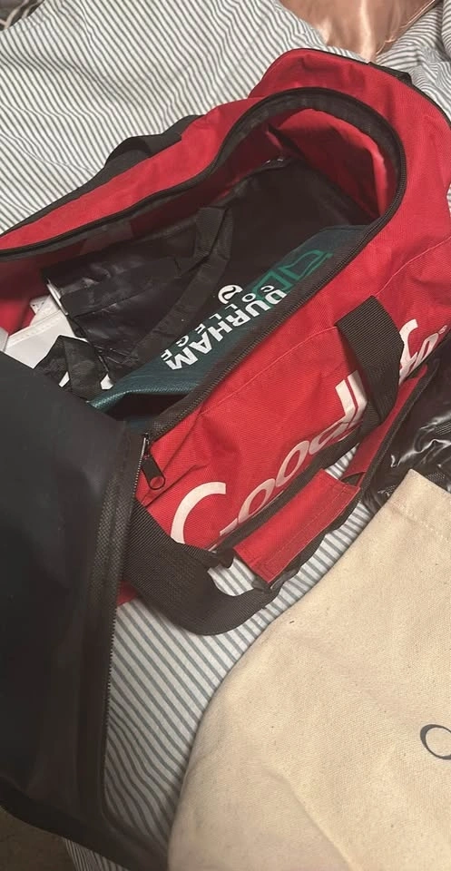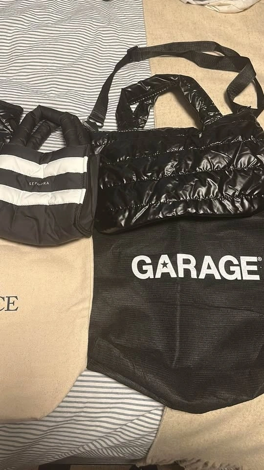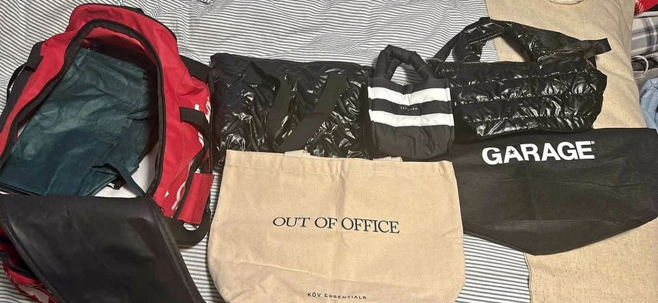 Versatile bag lot available! Includes a red goodlife duffel bag, a black puffy Sephora bag, another black puffy tote, a beige 'Out of Office' KÖV Essentials canvas bag, and a black Garage mesh bag etc.. Great for travel, shopping, or everyday use. Take all for $10. PPU manning and anderson.