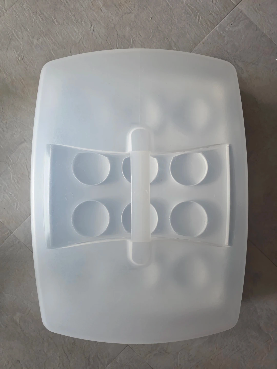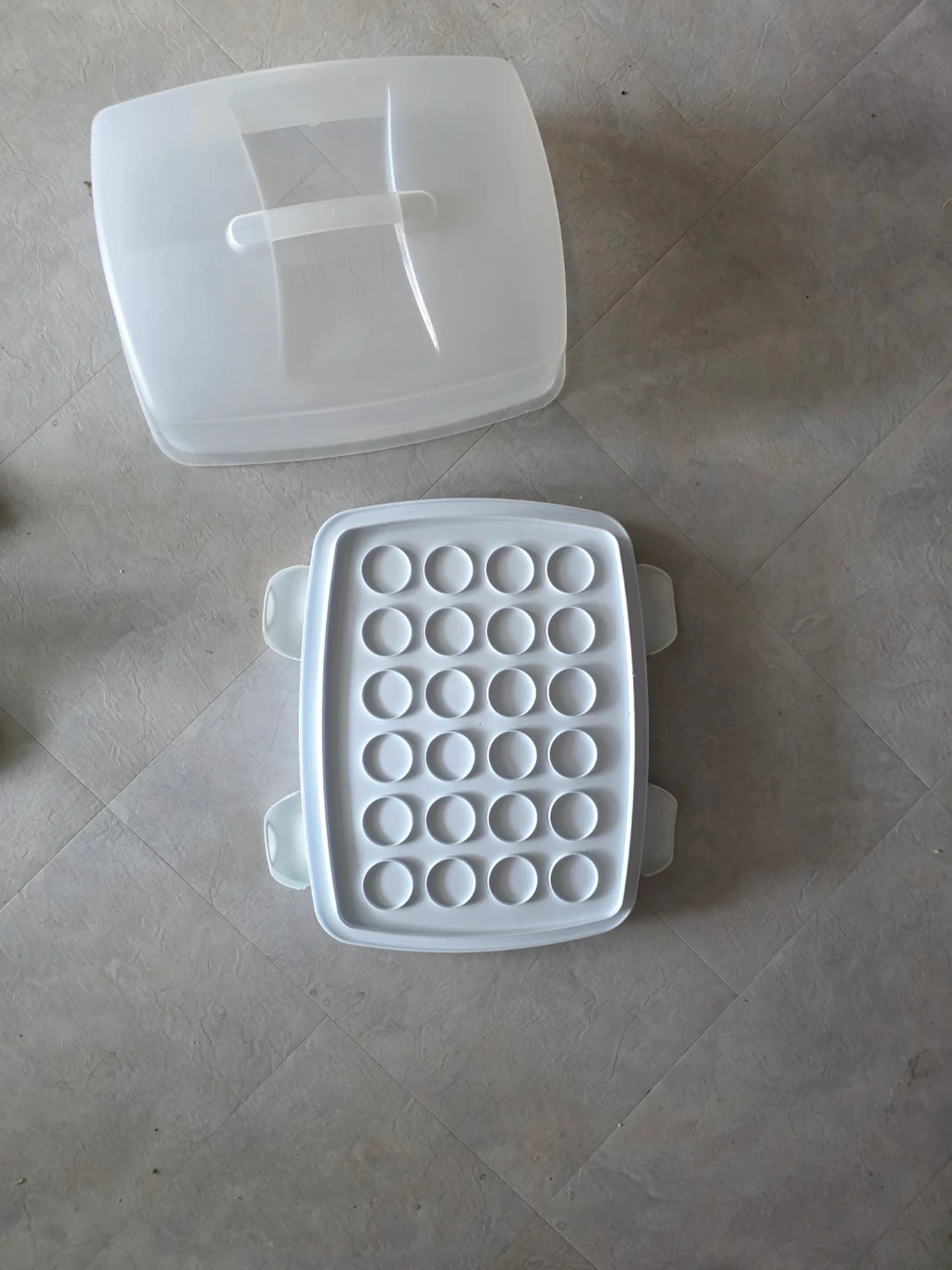 This 2-tier carrier holds up to 24 cupcakes with individual cradles. It's made of white plastic and includes a clear lid with a handle for easy transport. The bottom tray is also designed to hold larger items like pies or cakes.
