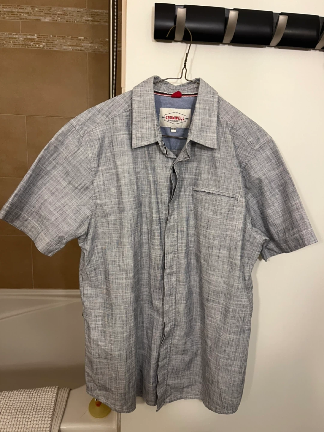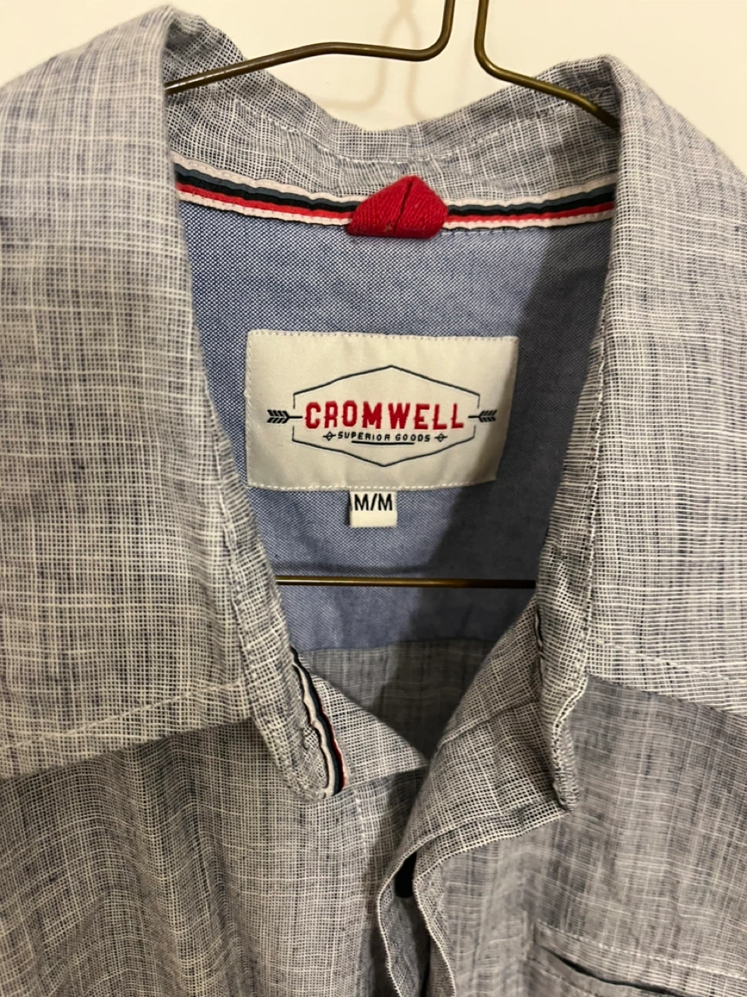 This is a Cromwell men’s short sleeve collared shirt. It's a size M. 100% cotton although it comes across as a linen blend.