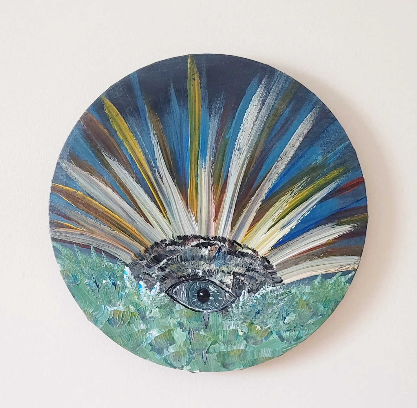 This wall art is a unique, round-shaped piece of art. It features a central eye motif surrounded by a stylized sunburst pattern in various colours like yellow, blue, and white against a dark background. The lower portion depicts a textured green landscape. The artwork is hand-painted.
