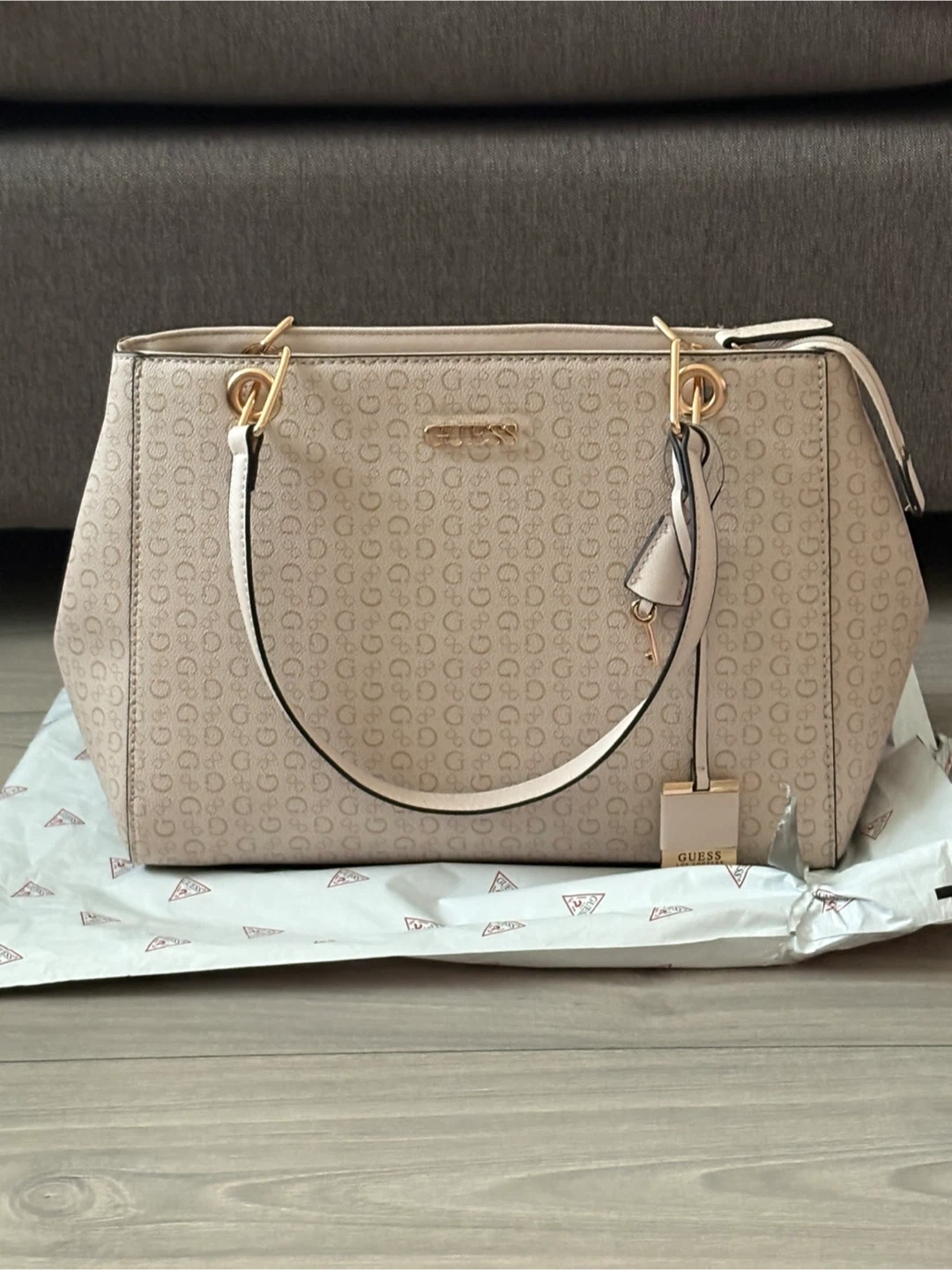 This is a stylish brand new Guess top handle handbag in a beige colour with a repeating monogram pattern. It's got a classic design and comes with a hang tag. The perfect accessory for everyday use! All the tags are on