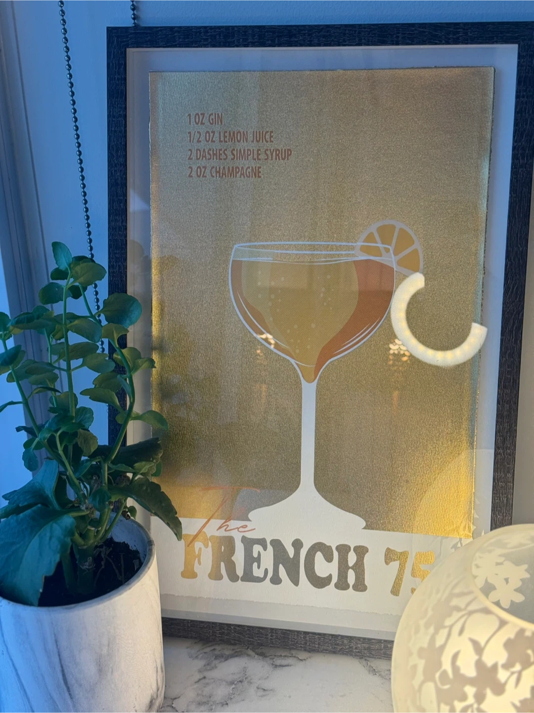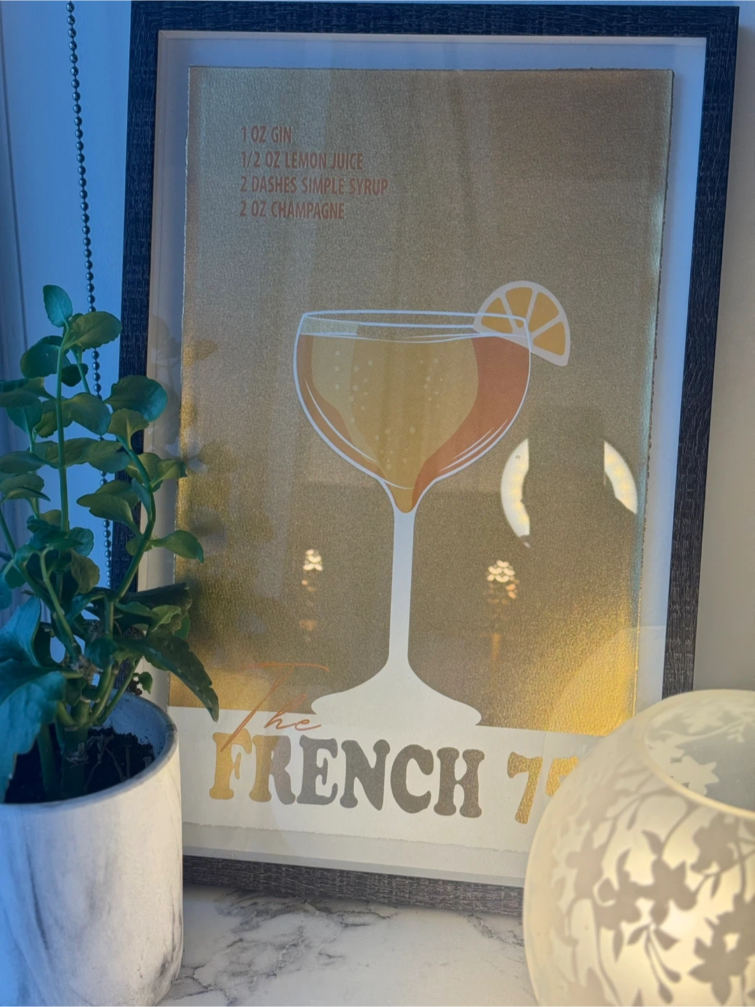Stylish framed cocktail art print featuring The French 75 recipe, perfect for elevating a home bar, kitchen, dining area, or condo living space. The soft neutral tones and minimalist illustration add a modern, curated look without overpowering the room.
