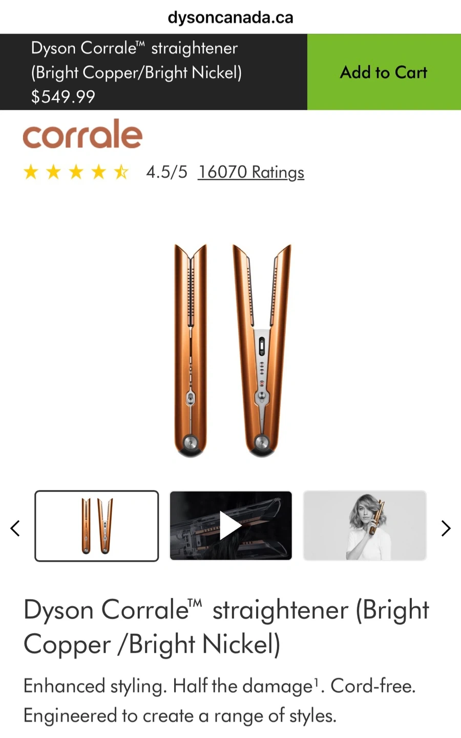 This is a Dyson Corrale straightener in Bright Copper and Bright Nickel. It's cord-free and engineered to create a range of styles with enhanced styling and half the damage. It comes with a charging stand.