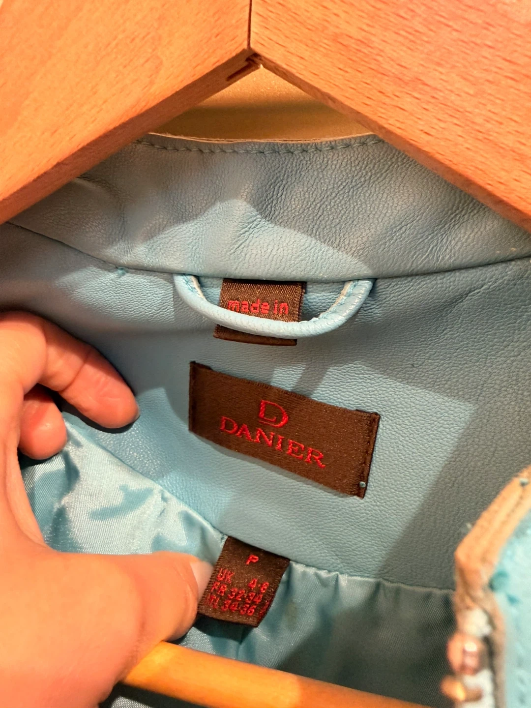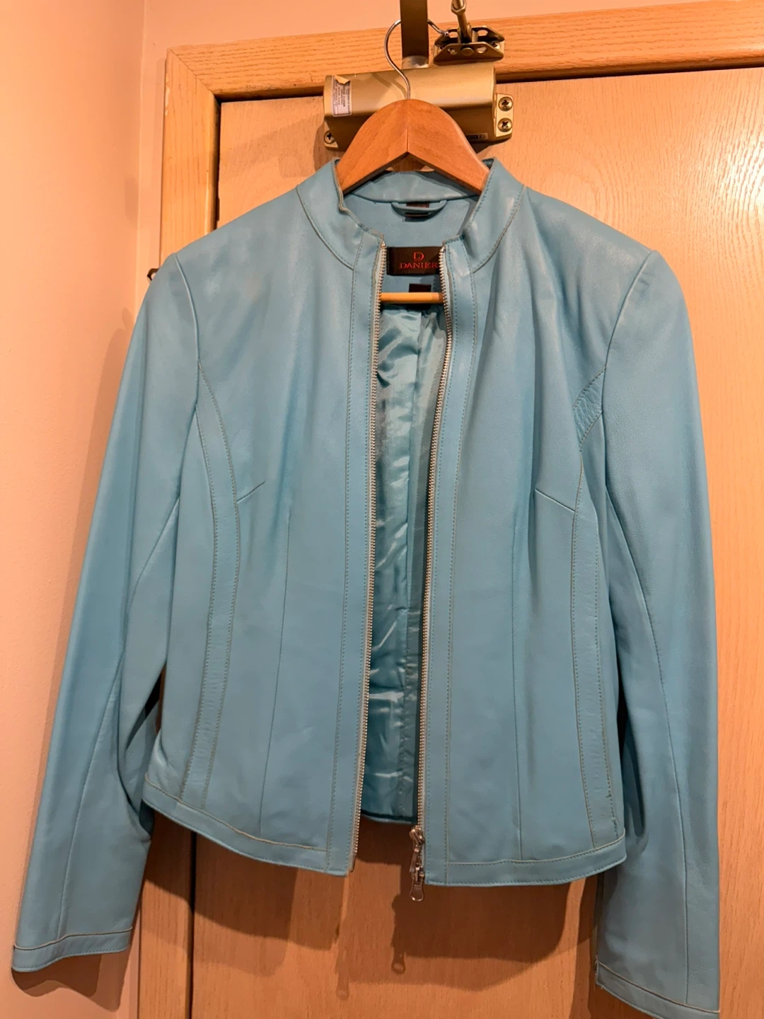 Selling a lovely Danier leather jacket in a beautiful light blue colour. The jacket is a size P, which is equivalent to a size 4-6. It's in great condition and ready for a new owner!