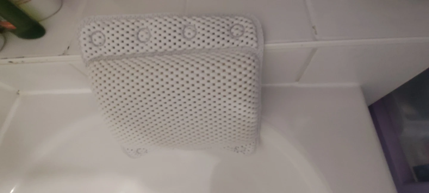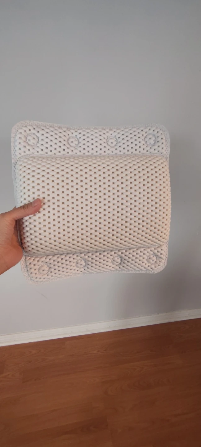 This bath pillow is made of a soft, mesh material. It attaches to the tub with suction cups. It's designed for extra comfort while bathing.
