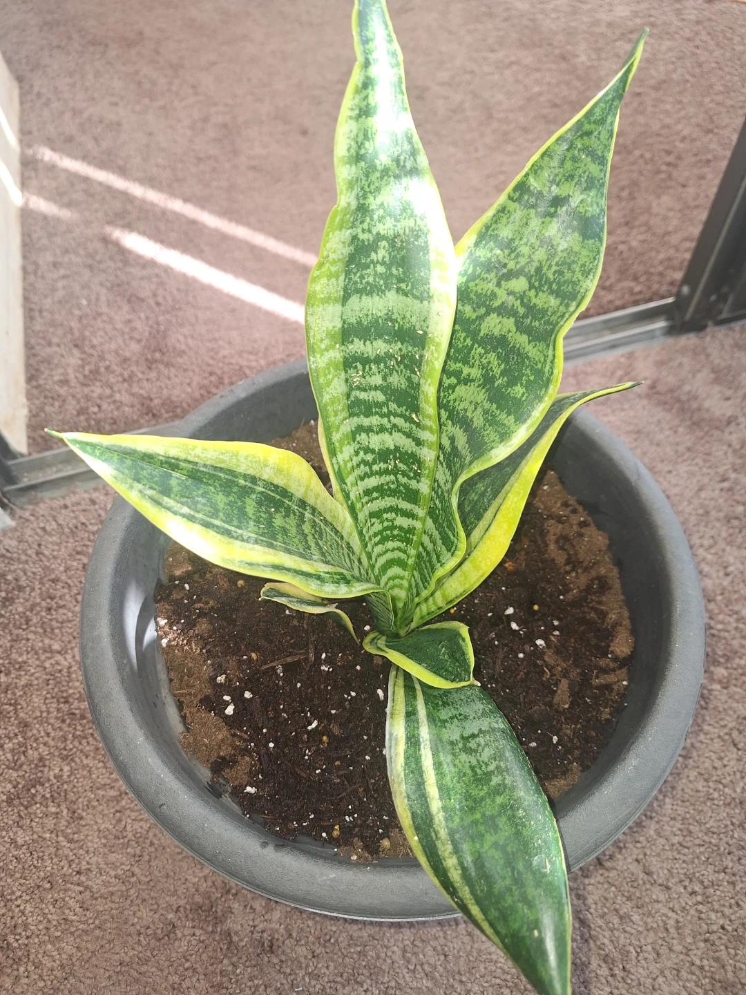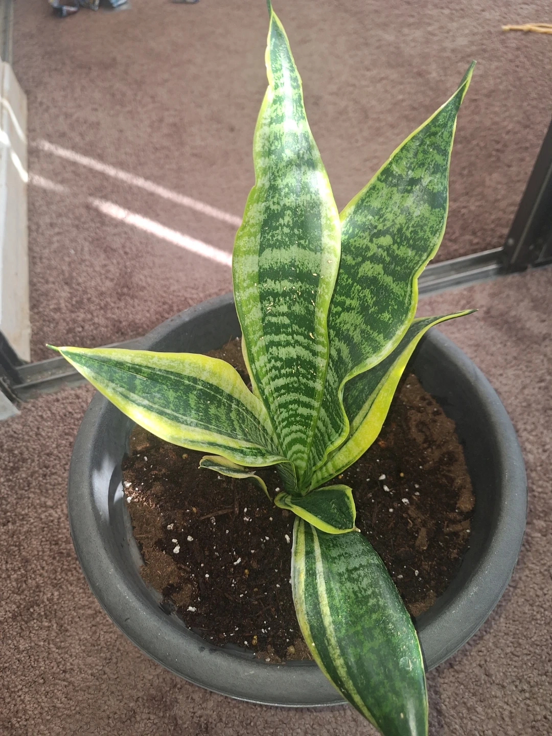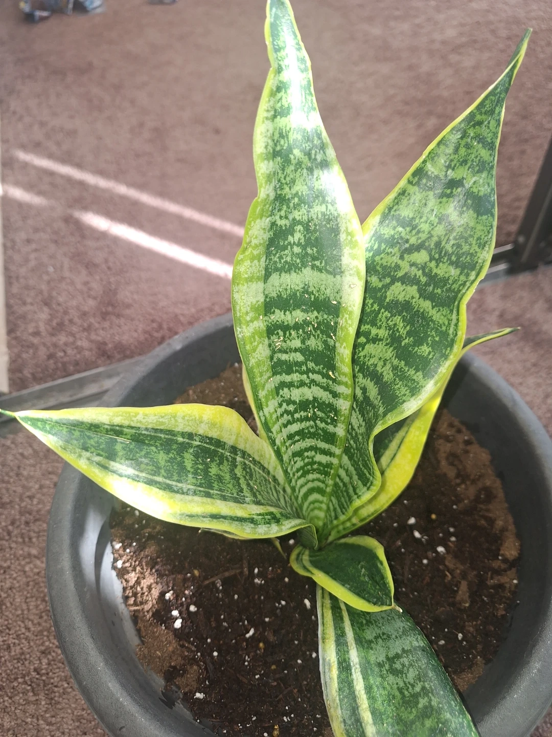 Pick up only. A healthy Sansevieria plant with variegated green and yellow leaves. It's in a grey plastic pot with soil. This plant is known for its air-purifying qualities. New soil changed. Easy to care. 17" tall