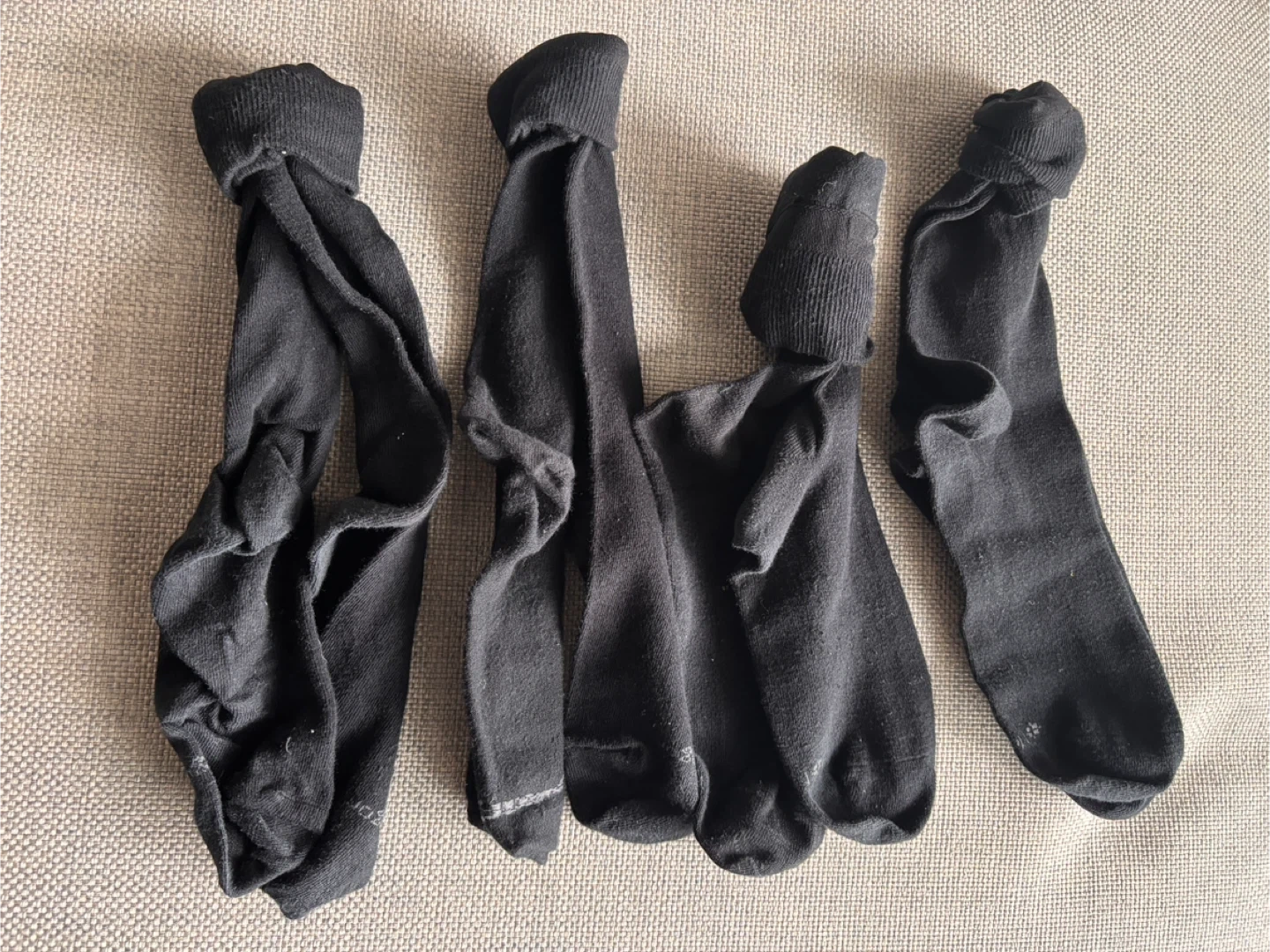 Four pairs of menβs black socks. Material is 100% Cotton. Mid-calf length. Comfortable for everyday wear.
