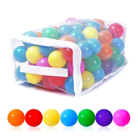 A mesh bag filled with colourful play balls. Includes various colours like red, blue, green, yellow, orange, purple, and pink. Balls are made of plastic.
