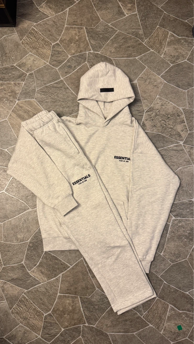 This is a light grey Fear of God Essentials hoodie and sweatpants set. It's made of a soft, comfortable material. This set is great for casual wear or lounging. DM for more photos and details. These are brand new as im selling them because I dont prefer uncuffed pants. The hoodie does not fit me.
